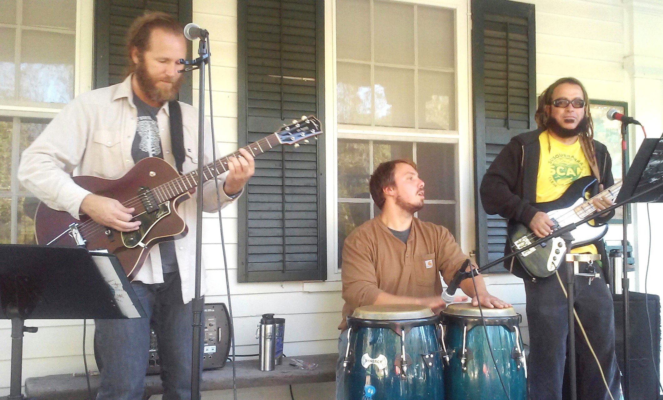 In addition to cider pressing, representatives of the Susquehanna County Dairy Promotions Team distributed cheese and crackers while two members of local folk rock band, Canary Circus, John Puzo (above, right) and Lonnie Griffiths (above, left) performed on the porch of the Wheaton House with guest percussionist, Eli Gere.
