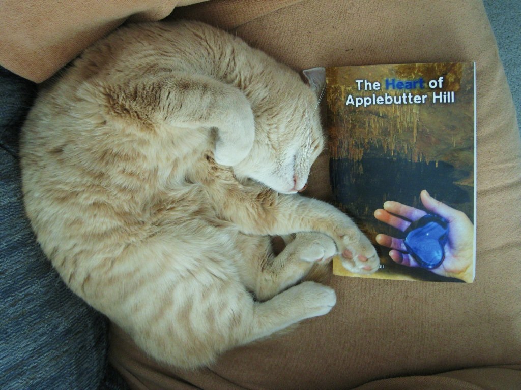 Donna and Mo (top) enjoy some quiet moments by the pond in Susquehanna County. Above, Goofus, the tabby who “found” the Hills, snuggles up to a copy of “The Heart of Applebutter Hill.”