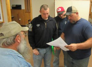 Auburn Township supervisors Dan Trivett (above, right) and George Gregory (left) look over ambulance coverage maps with Meshoppen Fire Company president Travis Prevost (second from right) and fire chief Chris Carney after the supervisors’ Oct. 3 meeting.