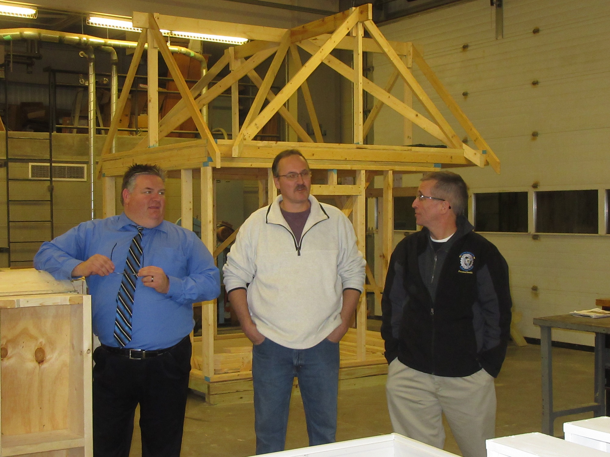 Instructor Darren Howell (center) explains the various facets of NTCC’s Building Construction Trades program, flanked by NTCC director Gary Martell (left) and Wyalusing School Board member Doug Eberlin.