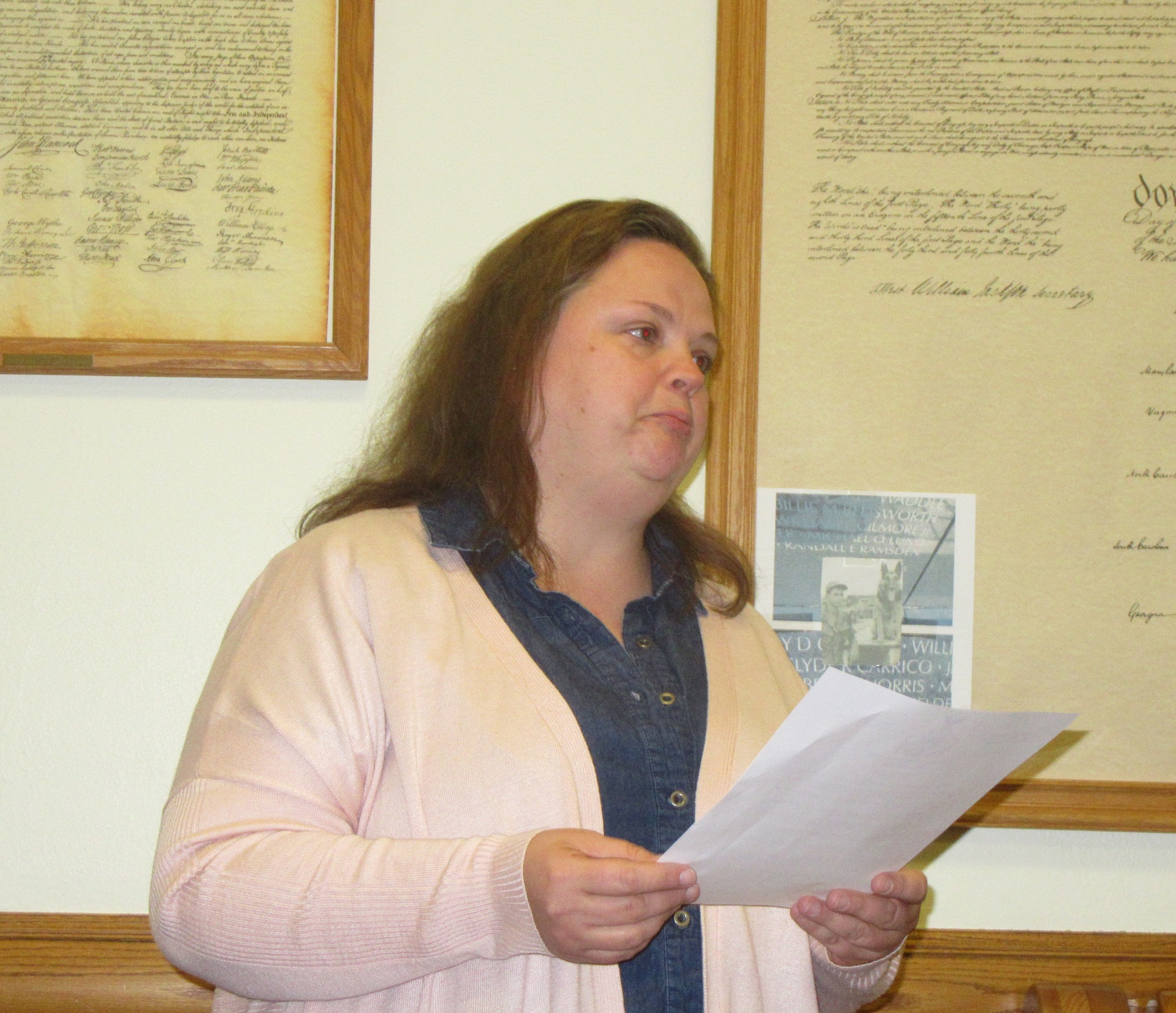 With tongue in cheek, Library System of Bradford County administrator Lea Chisum-Chaffee took advantage of a captive audience at the April 11 meeting of the Bradford County Commissioners by telling them that her research revealed that none of them had current library cards. She remedied the situation by bringing new cards for them and also read a proclamation acknowledging April 8 to 14 as National Library Week.