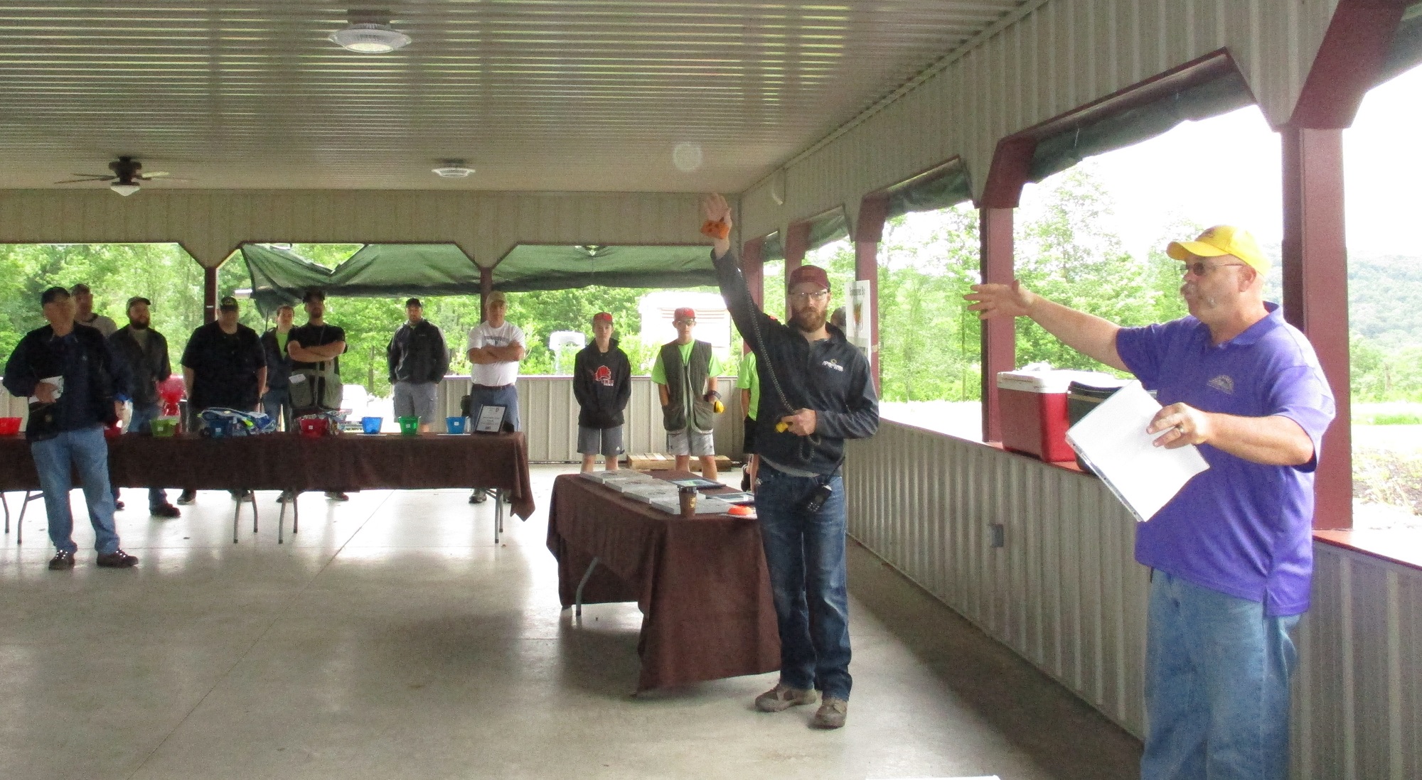 Mike Koneski (right) and son Tad give a safety talk to participants before the start of Breaking Clays for Kids.