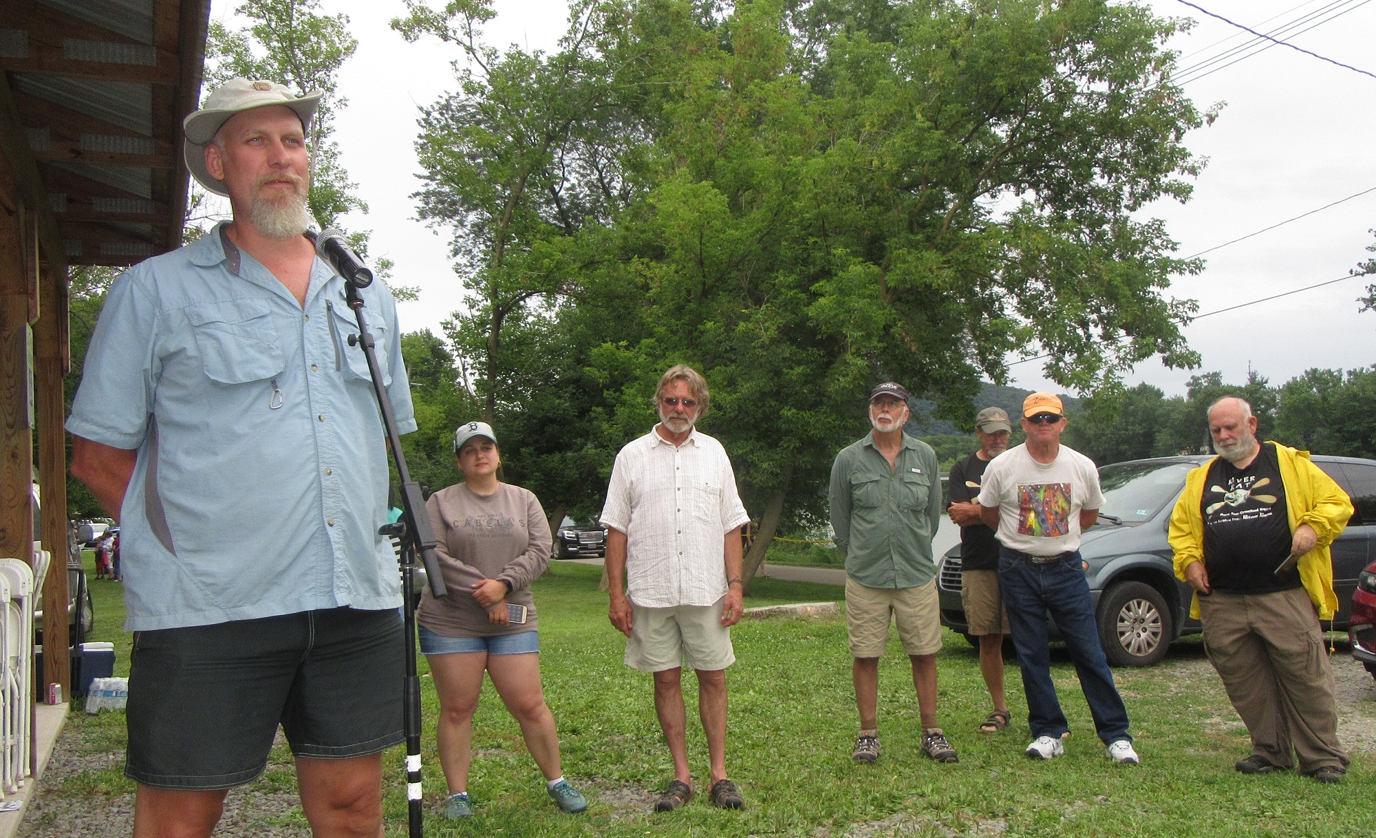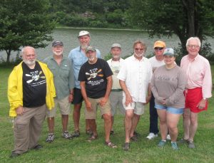 Members of the 444 Club of paddlers who have covered the entire length of the North Branch Susquehanna River and main stem to Maryland in attendance on Saturday included (from left) Gordon Southard, Tom Babcock, Dana Rockwell, Ed McLaughlin, Rick Shumaker, David Buck, Jim Wellington, Emily Rinaldi and Rich Fitzsimmons.