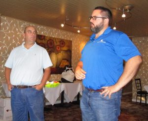 Pat Trowbridge (left) and Travis Prevost of the Meshoppen Volunteer Fire Company take in new information about water withdrawals and driver training from Cabot spokespersons.