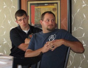 Rob Gorczyk (left) and Bill desRosiers (right) of Cabot, and Phil McKeon of BX3 Rental (second from left) treated local firefighters to a dinner at Twigs Cafe in Tunkhannock on Aug. 26, at which they also presented equipment and a line of credit for the Lake Carey, Meshoppen, Nicholson and Triton fire companies. Displaying the gifts are (continuing from left) Andrew Hollister and Ron Tanner of Lake Carey; Nathan Learn from Triton; Travis Prevost, Darren Hillard, and Pat Trowbridge of Meshoppen; and Colby Yurksza from Lake Carey.