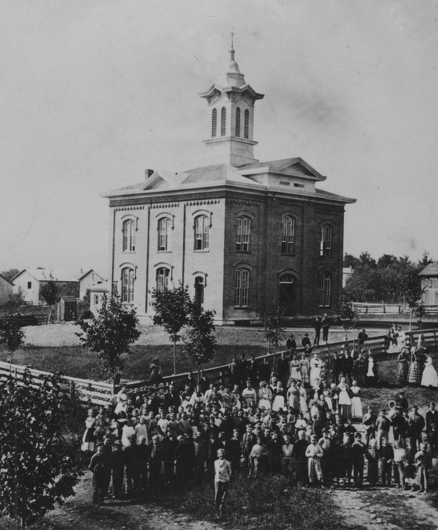 Canton’s first public school as seen around 1870 with students and faculty.