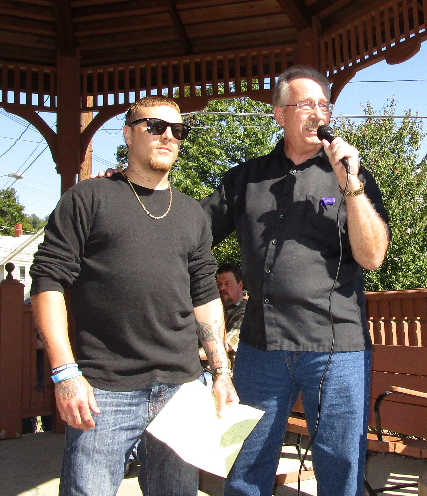 Family support is a strong component to recovery, and Jason Rought (top) had some pint-size backstage help during the Sept. 21 rally as he shared his story with the crowd. Above, Wyoming County human resources director Mike Donahue (right) introduces Roger Canfield to the audience.
