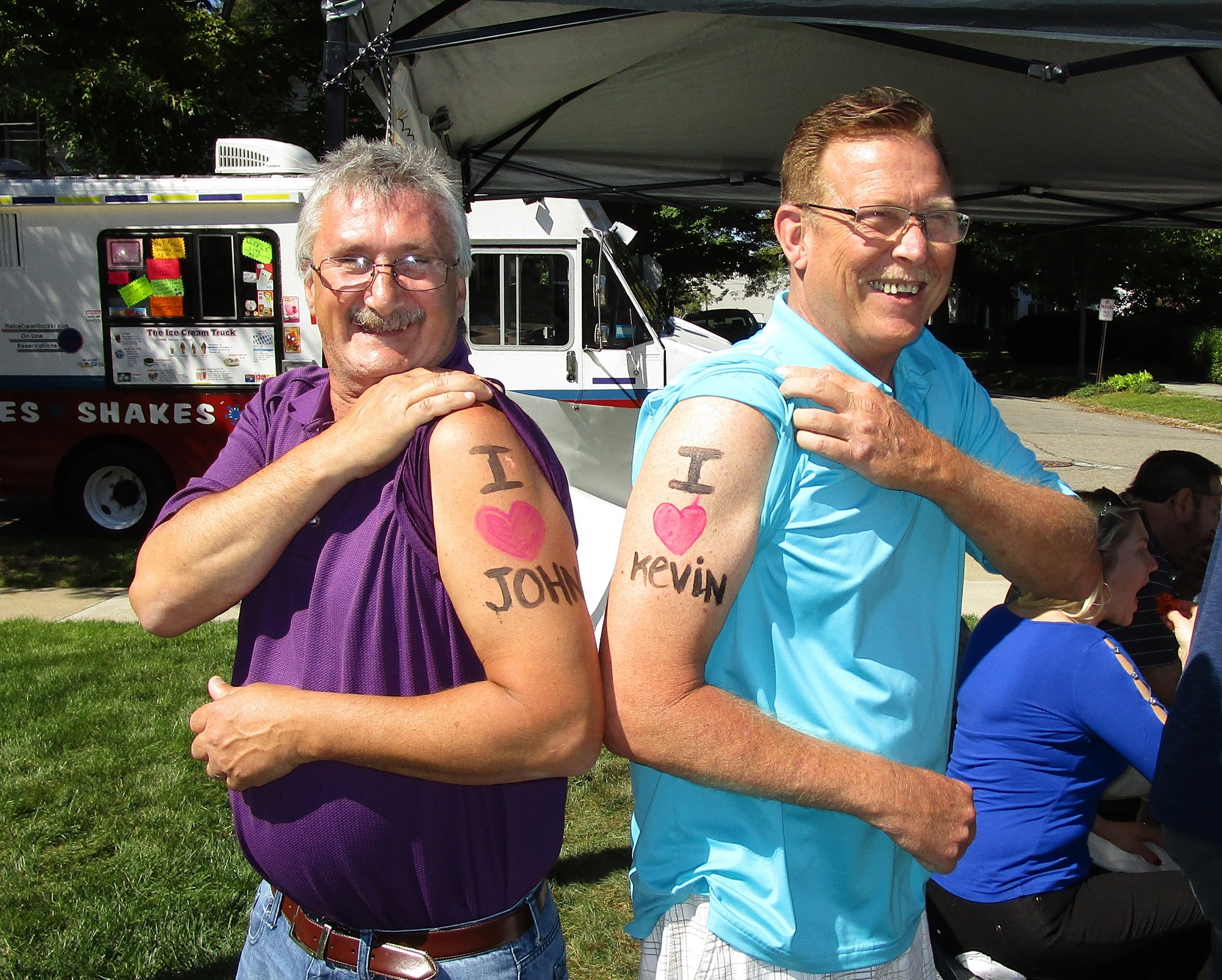 Local drug and alcohol counselors Kevin and John express their admiration for each other with temporary tattoos.