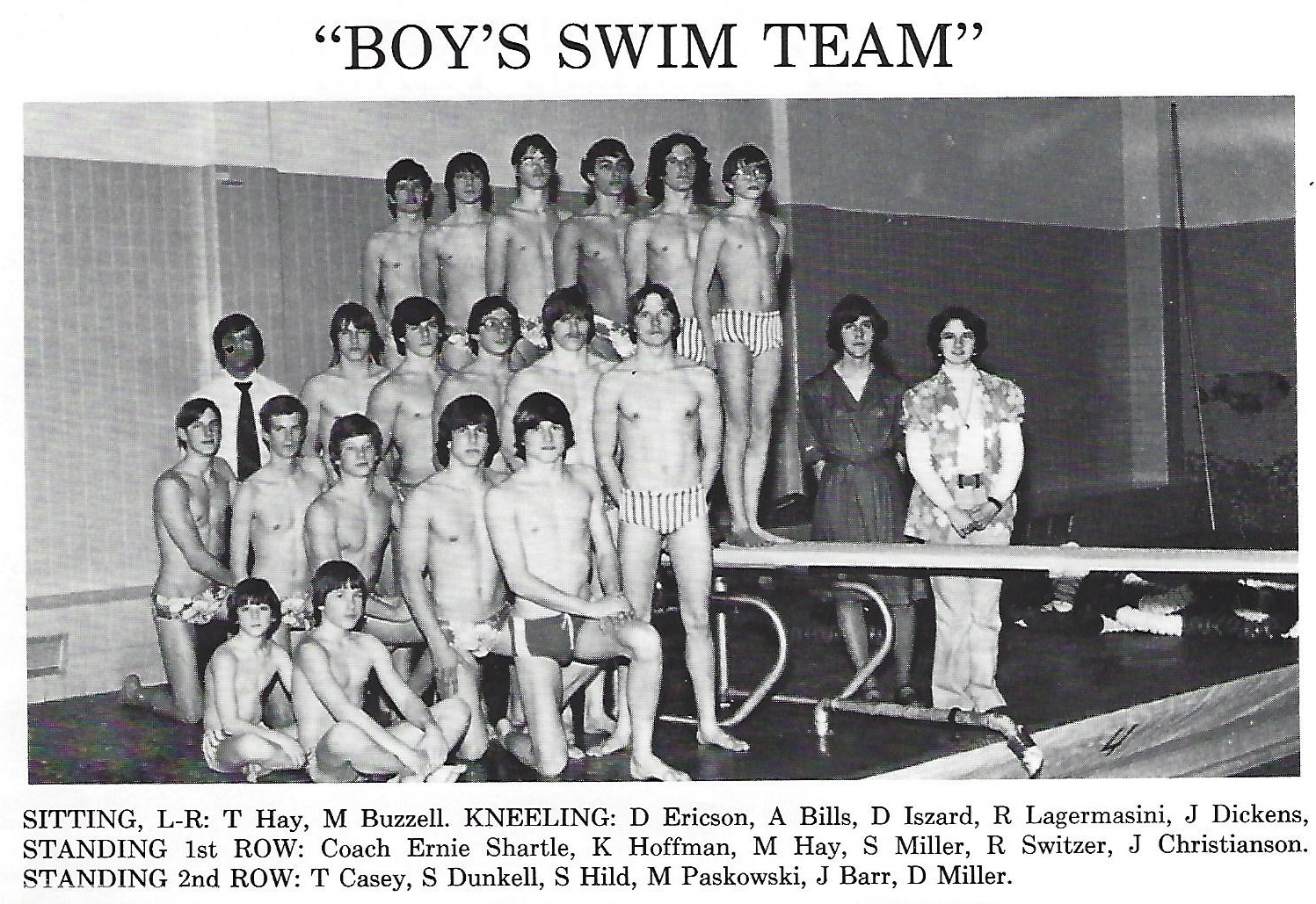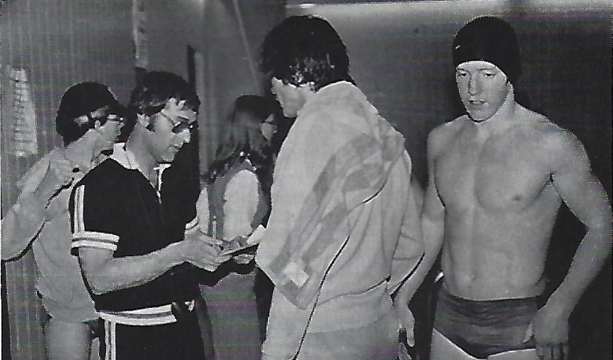 Coach Shartle talks strategy with members of the 1978-79 Tunkhannock Tigershark swim team in top photo and poses with the 1976-77 Towanda Black Knights swim team above. Current divers and swimmers of both teams will participate in an invitational tournament on Jan. 19 and 20.