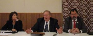 At a Bradford County Commissioners meeting held at the Smithfield Township VFW Hall on Oct. 25, commissioner Doug McLinko (center) explained the recent closing of the flight school at the Bradford County Airport. He is flanked by county chief clerk Michelle Shedden (left) and commissioner Daryl Miller. Commissioner Ed Bustin was in Washington D.C. and participated via conference call.