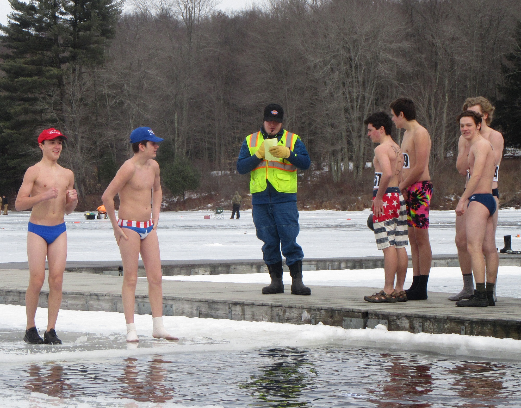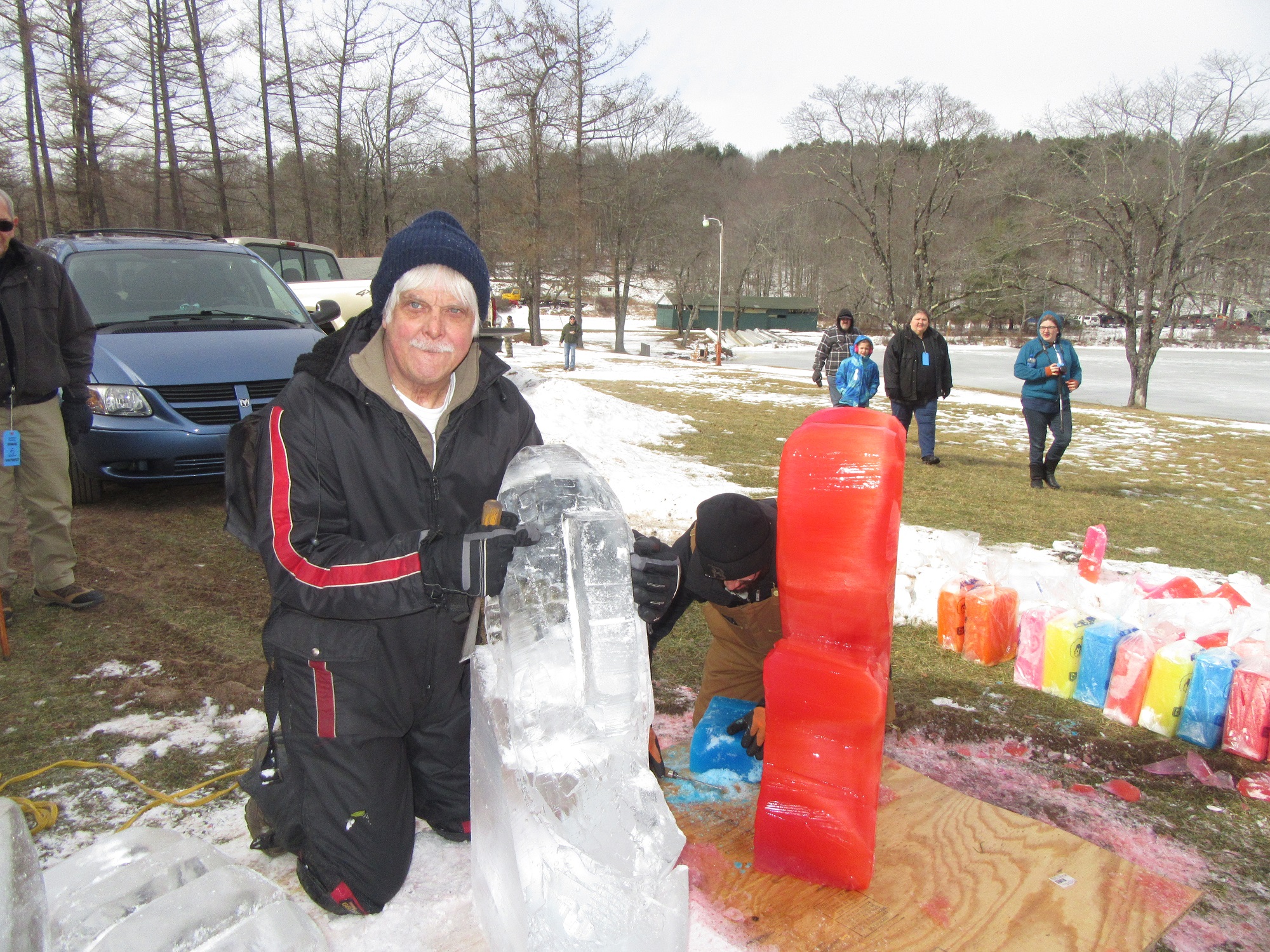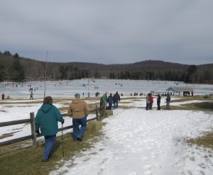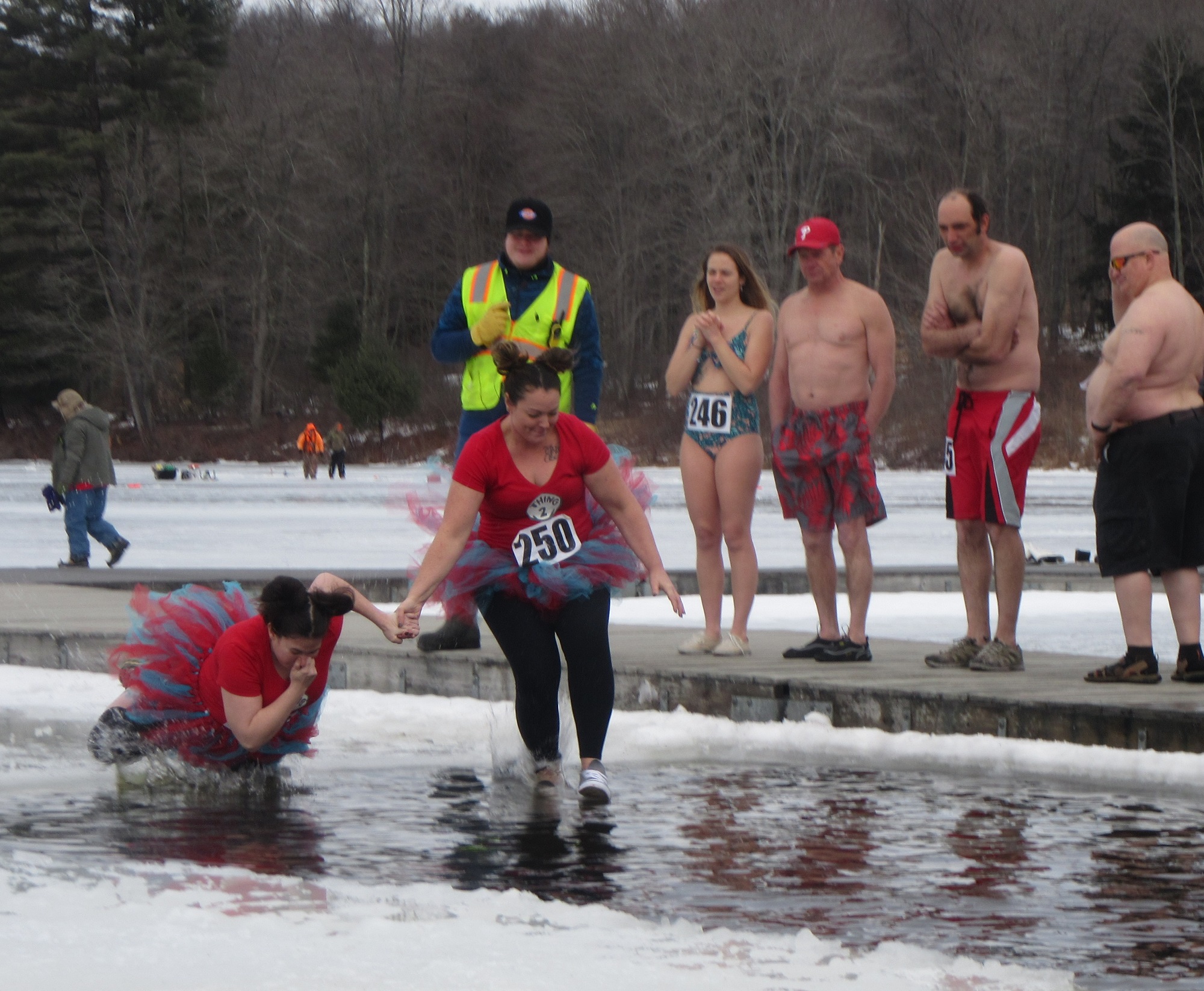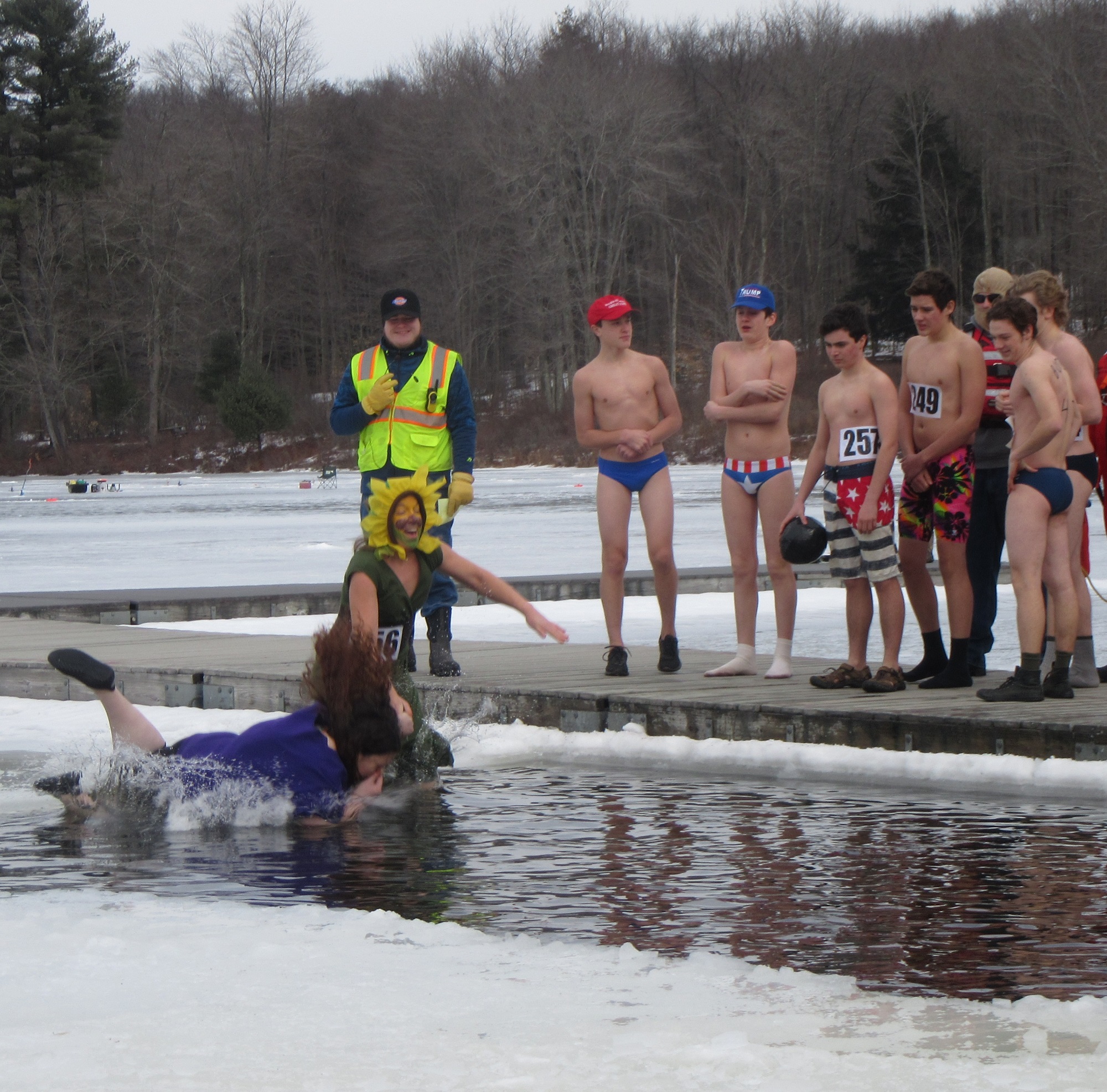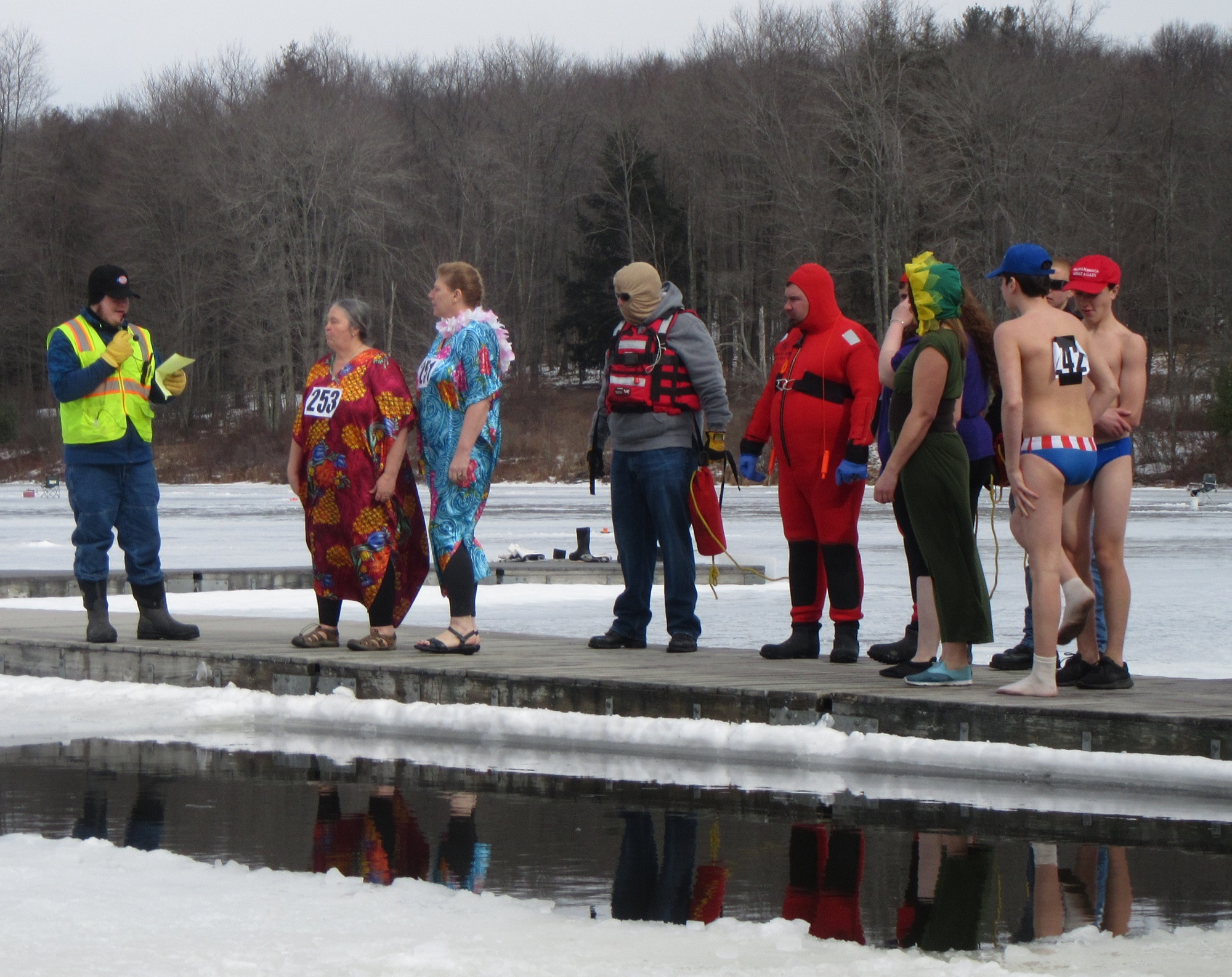 Hundreds of people were spread out across the lake, fishing and skating, and even more were moving about the grounds of the historic Boy Scout camp, enjoying hot food, a warm fire, and the renderings of ice carvers and other artisans. Just before noon, the crowd was invited to the dock, where emcee Ben Hatch greeted them and to which Kiwanis Club of Sullivan County president Darlene Fenton led the parade of “plungers.”