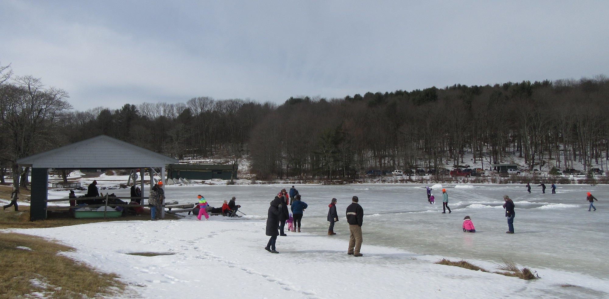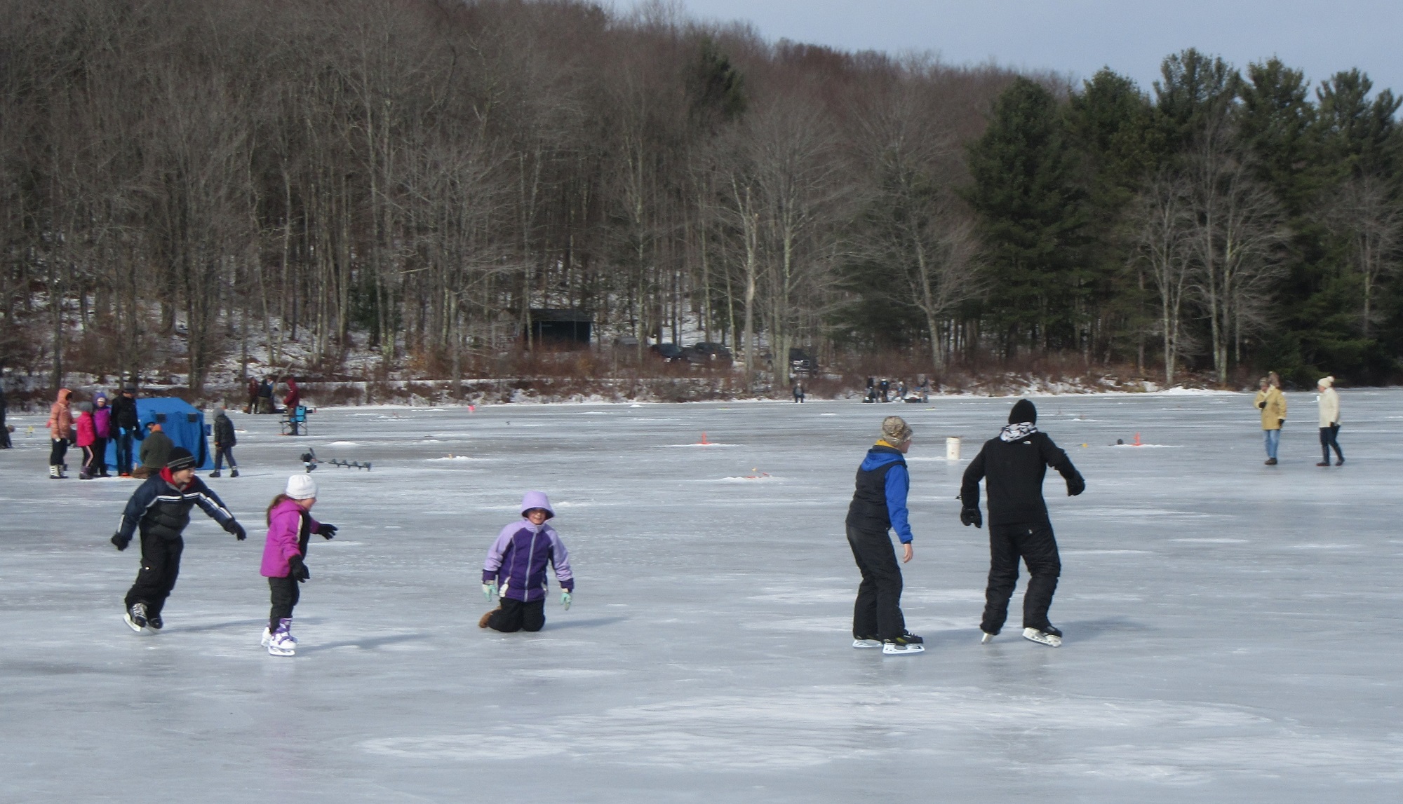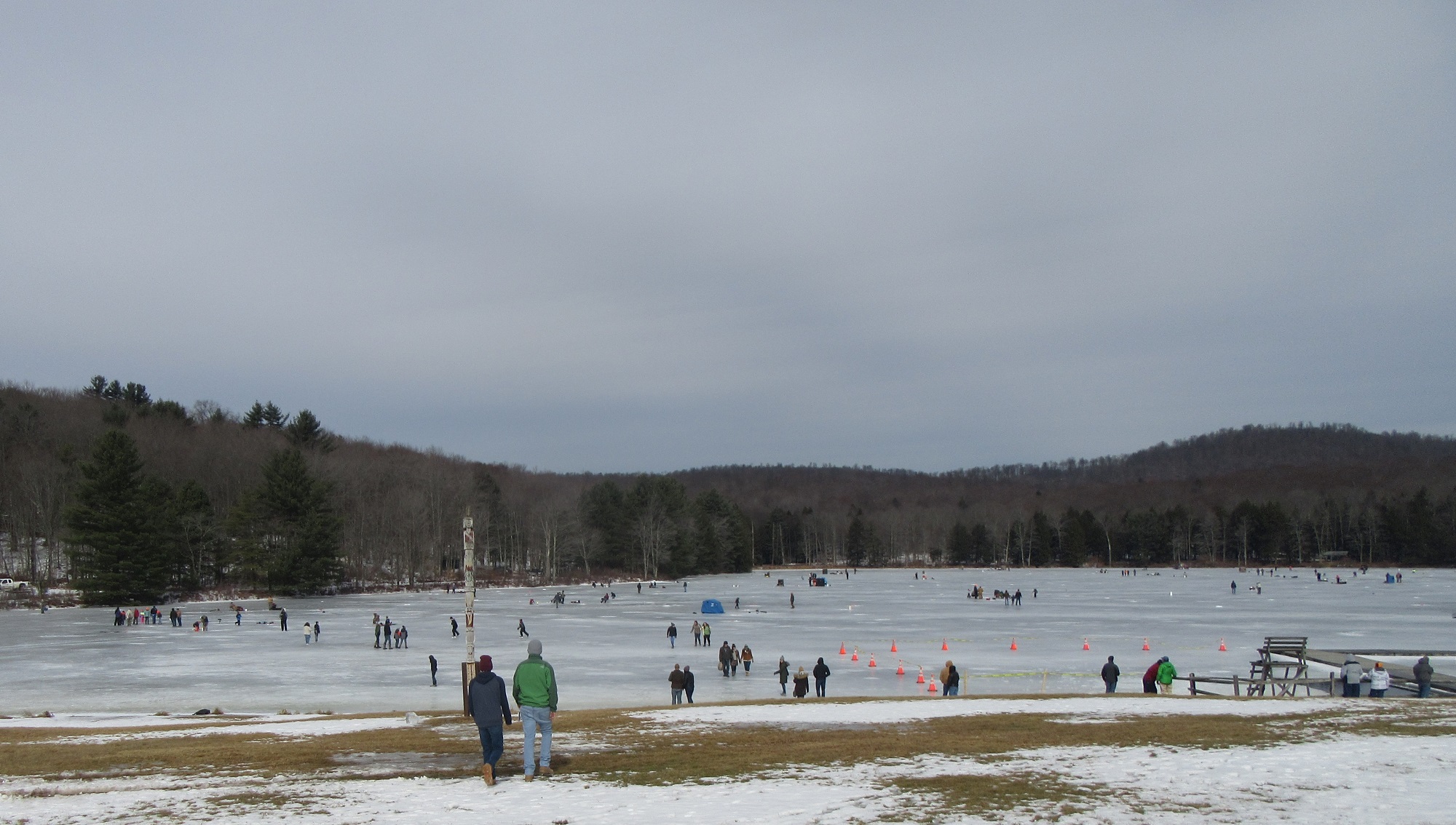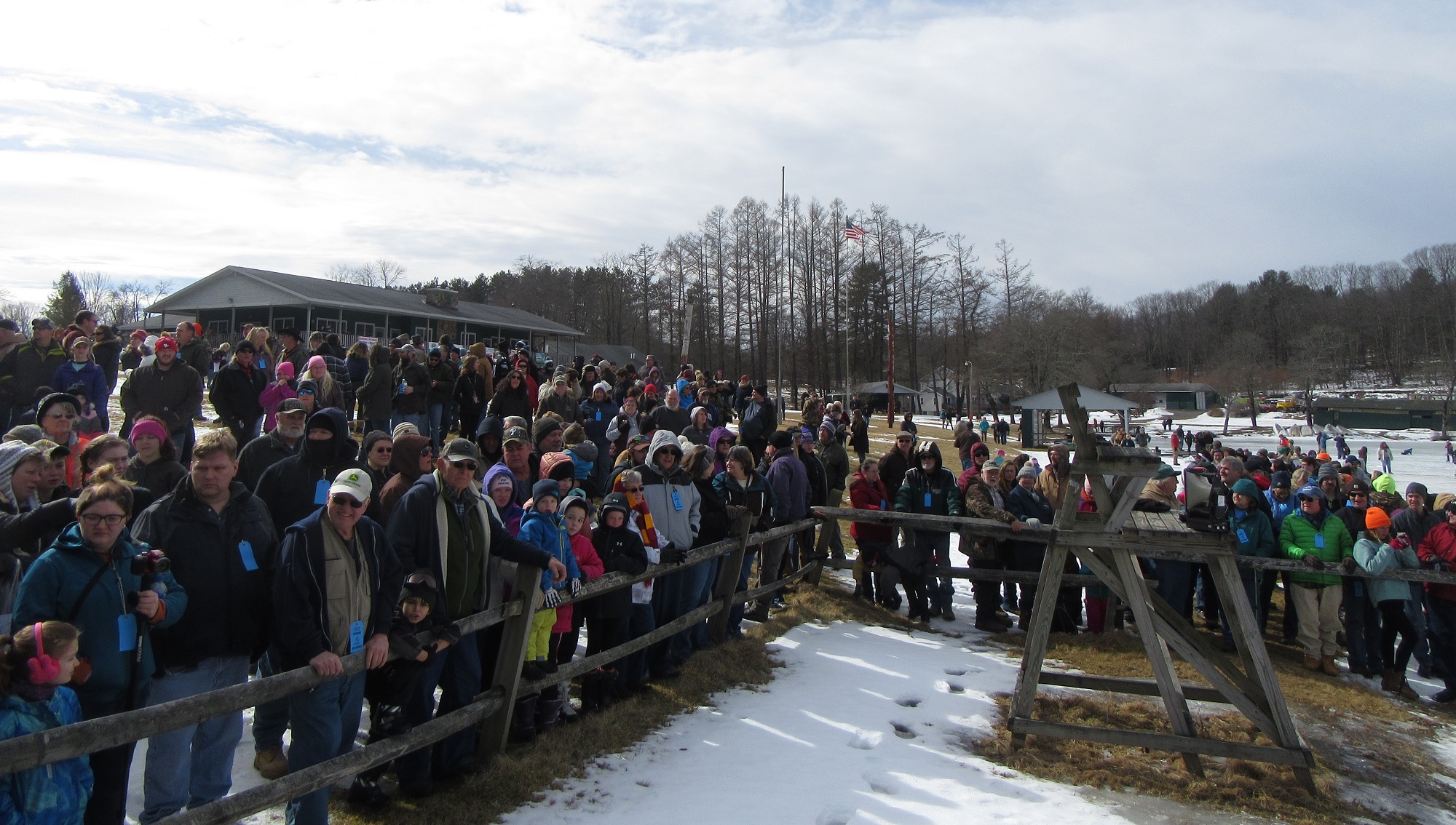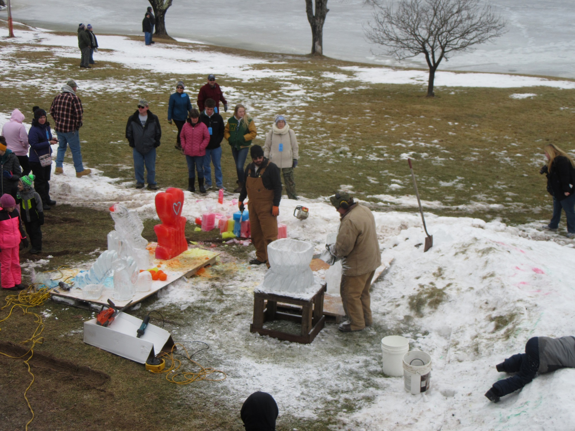 Hundreds of people were spread out across the lake, fishing and skating, and even more were moving about the grounds of the historic Boy Scout camp, enjoying hot food, a warm fire, and the renderings of ice carvers and other artisans. Just before noon, the crowd was invited to the dock, where emcee Ben Hatch greeted them and to which Kiwanis Club of Sullivan County president Darlene Fenton led the parade of “plungers.”