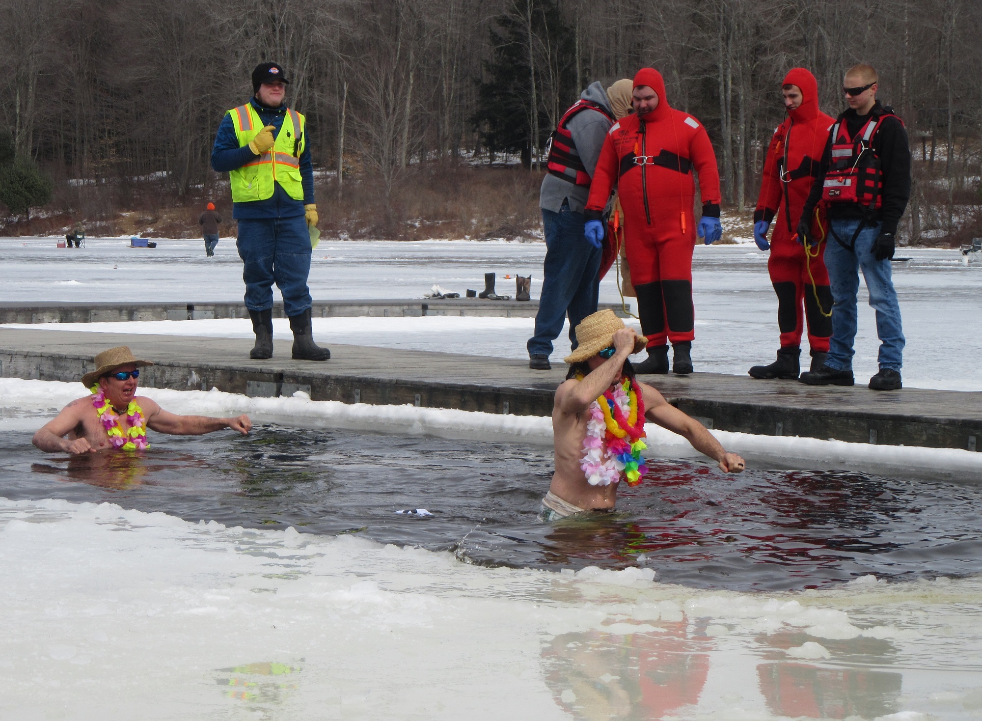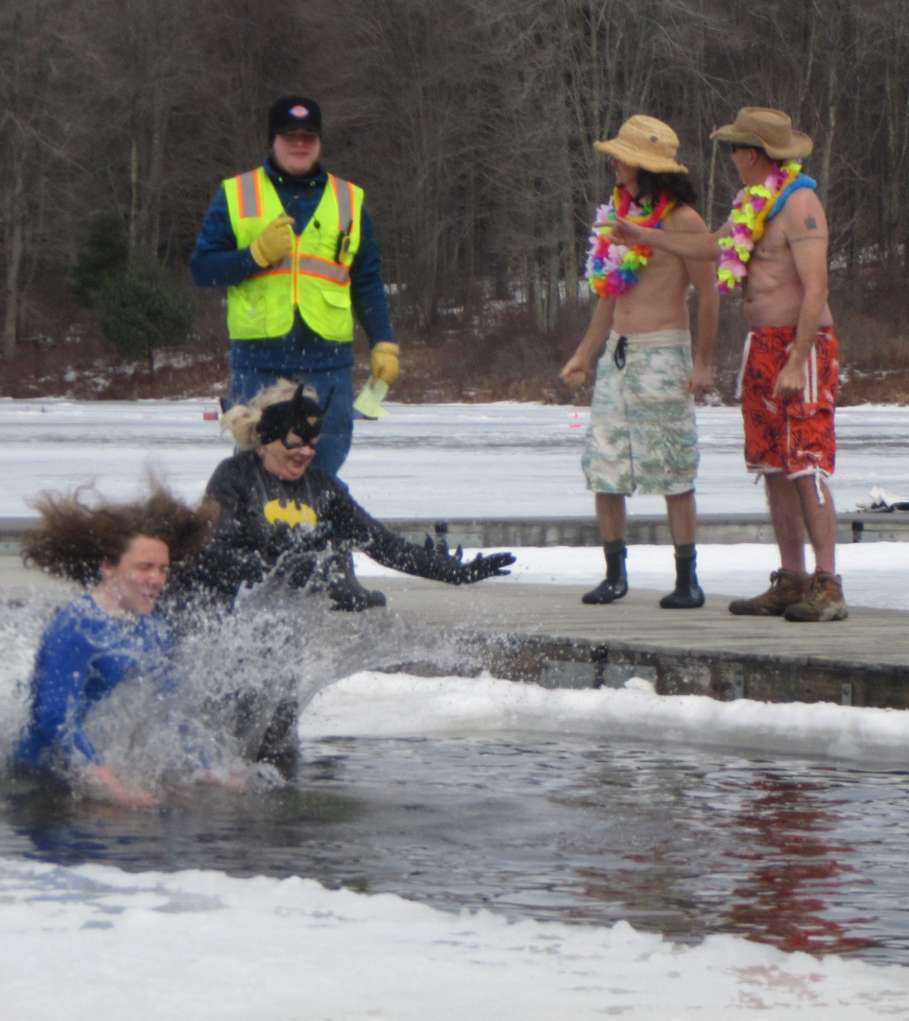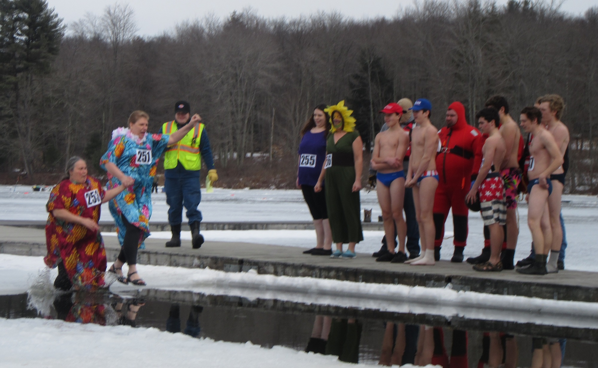 Twenty five people, including Boy Scouts and others sporting colorful costumes, jumped into the shoulder-deep water through a rectangular opening in the ice, which was about six inches thick near the shoreline. Long-time Kiwanis member and Winterfest promoter Cindi McCarty (above, second from left) led the pack, jumping with Chrissy McMahoh, both of them sporting muumuus and leis.
