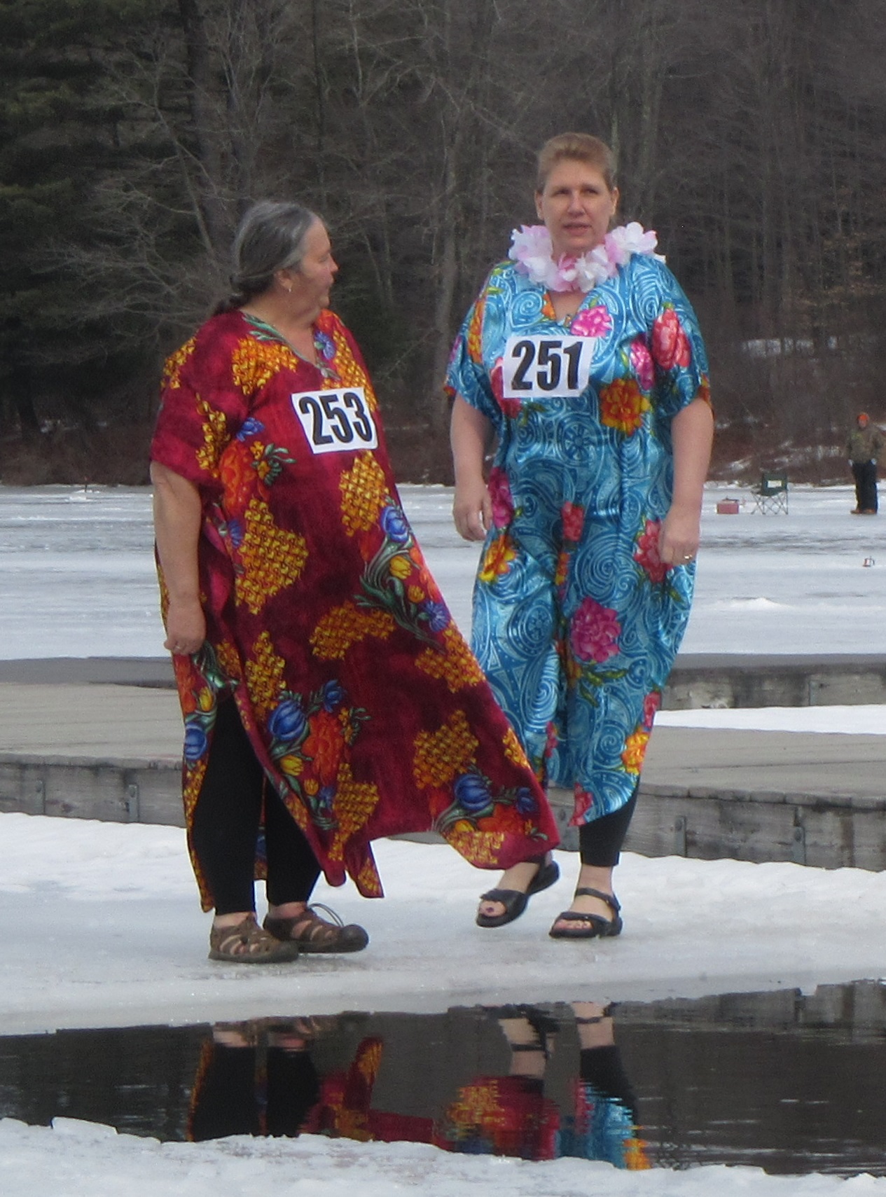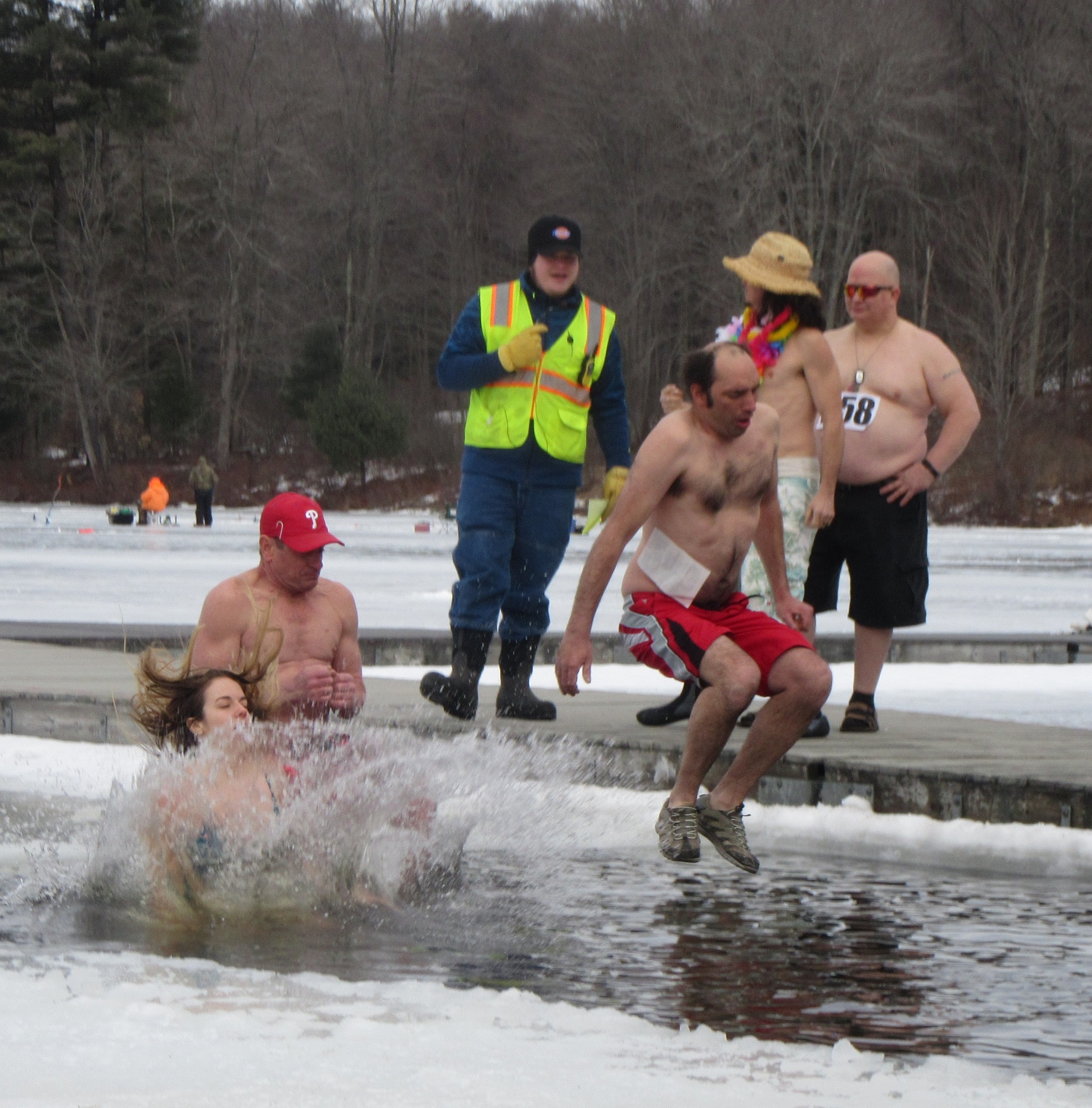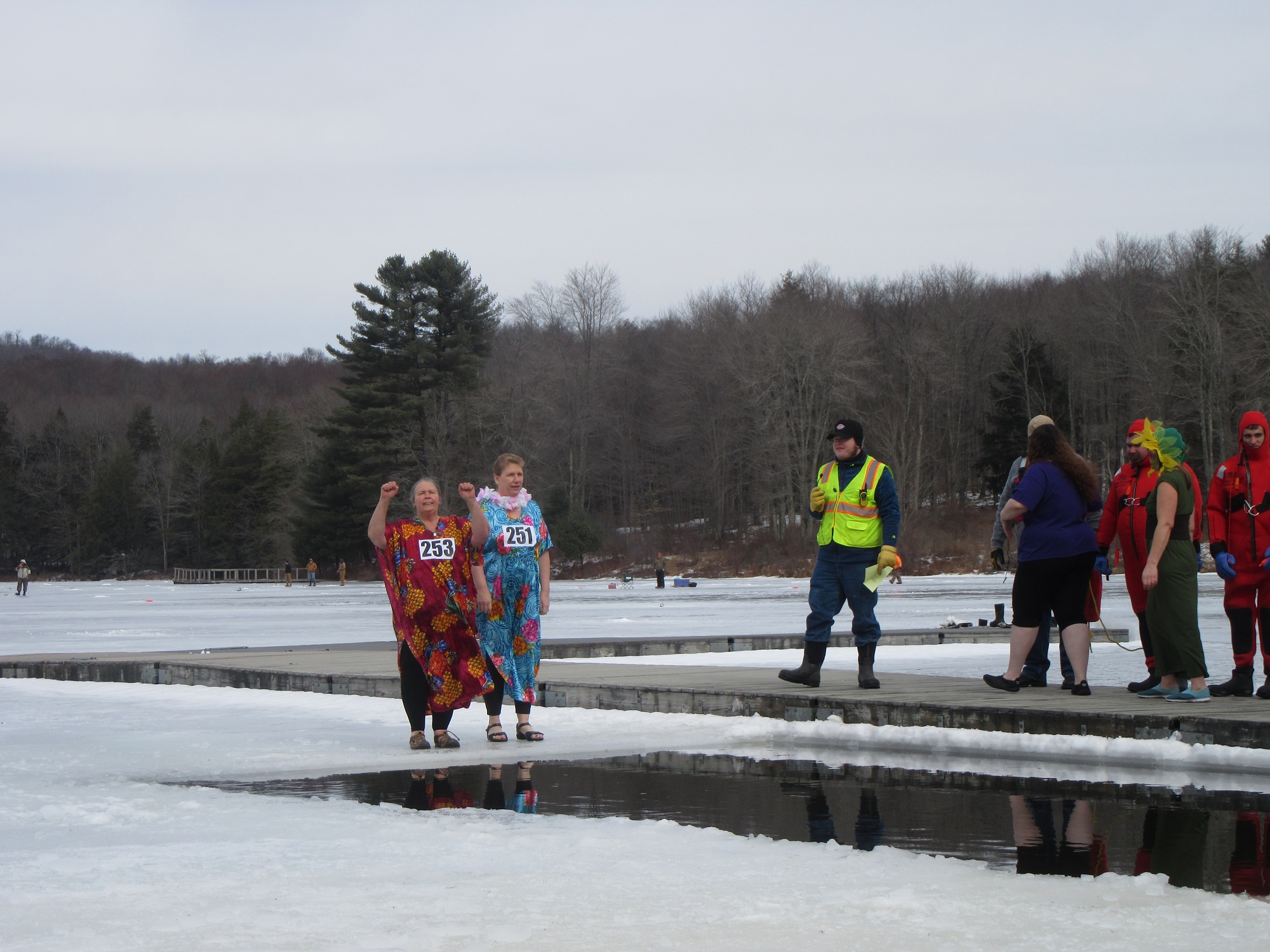 Twenty five people, including Boy Scouts and others sporting colorful costumes, jumped into the shoulder-deep water through a rectangular opening in the ice, which was about six inches thick near the shoreline. Long-time Kiwanis member and Winterfest promoter Cindi McCarty (above, second from left) led the pack, jumping with Chrissy McMahoh, both of them sporting muumuus and leis.