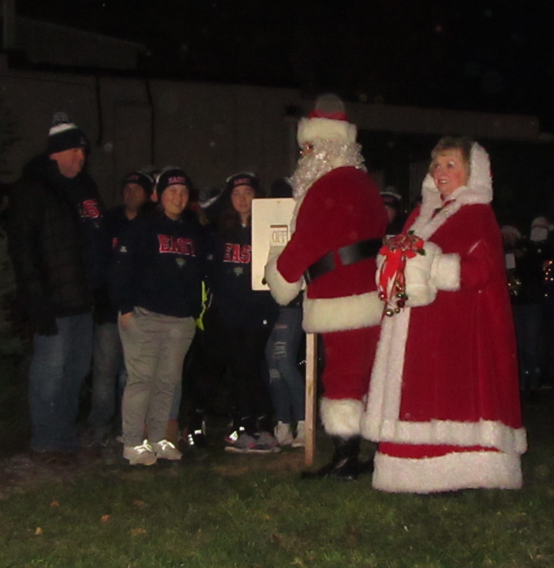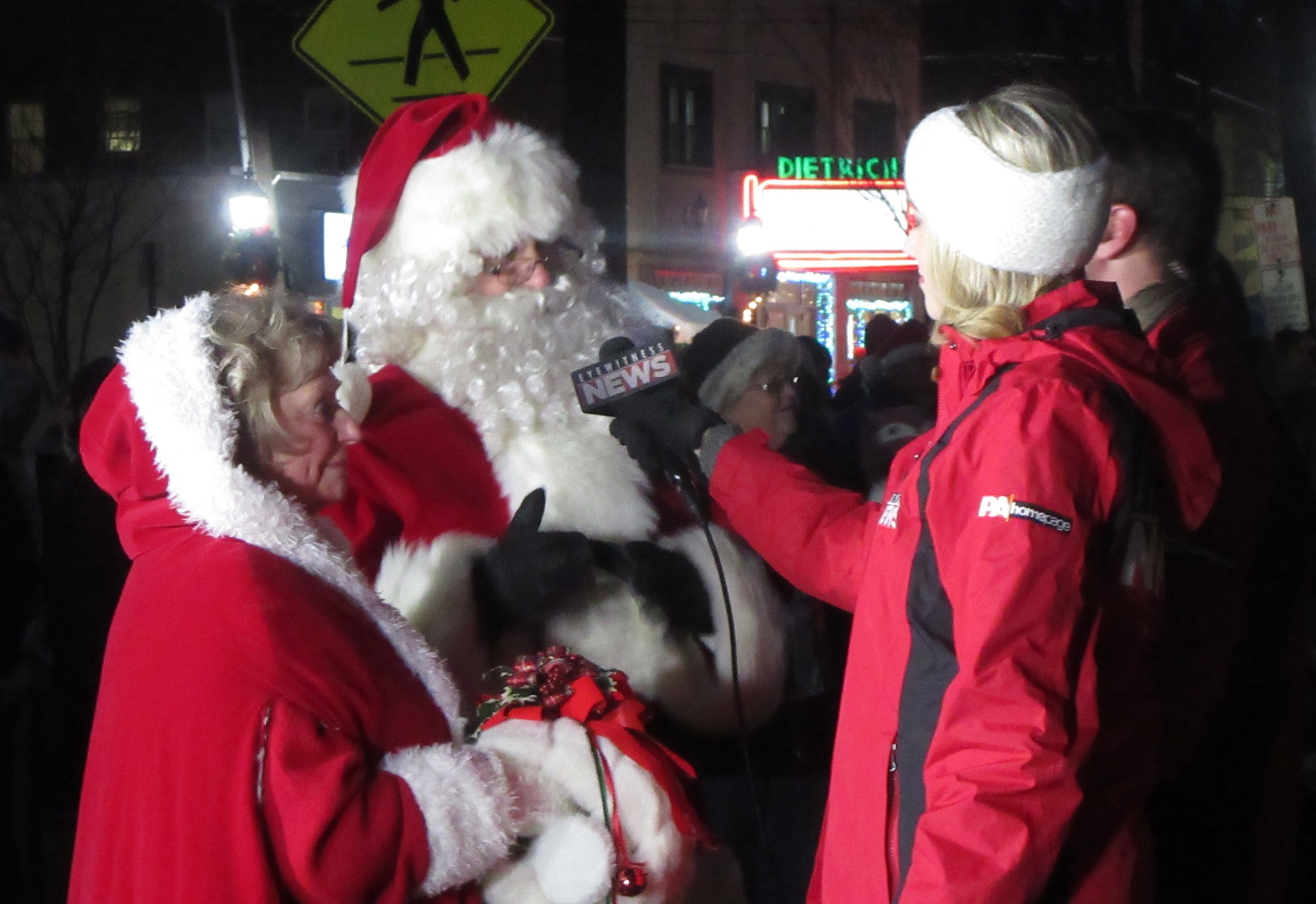 The Tunkhannock High School Marching Band, led by the Girls Little League East Coast Champions (above), guided Santa’s wagon down Tioga Street to Peoples Security Bank, where the Clauses met Chris Langlois and Kelly Byrne of Eyewitness News (below) for a live telecast of the official lighting of the borough Christmas tree.