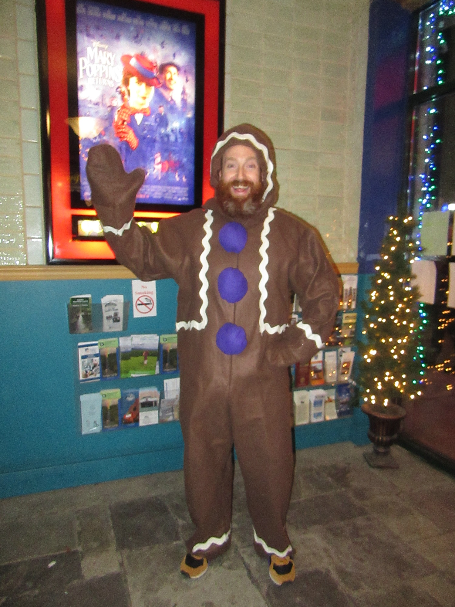 David Swanson, decked out as a gingerbread man, greeted visitors to the Dietrich Theater on Friday night.