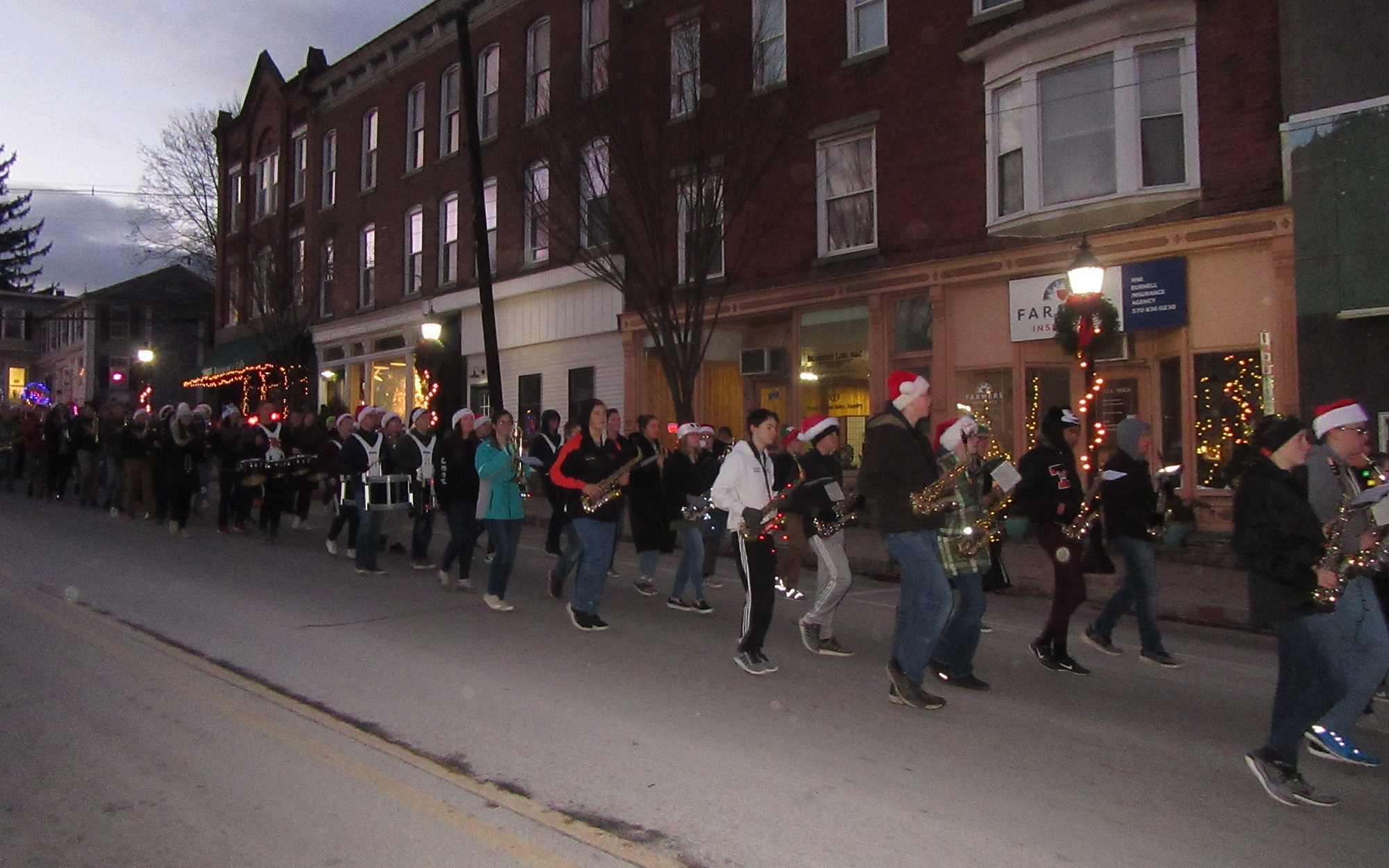 The Tunkhannock High School Marching Band leads Santa and Mrs. Claus down Tioga Street.