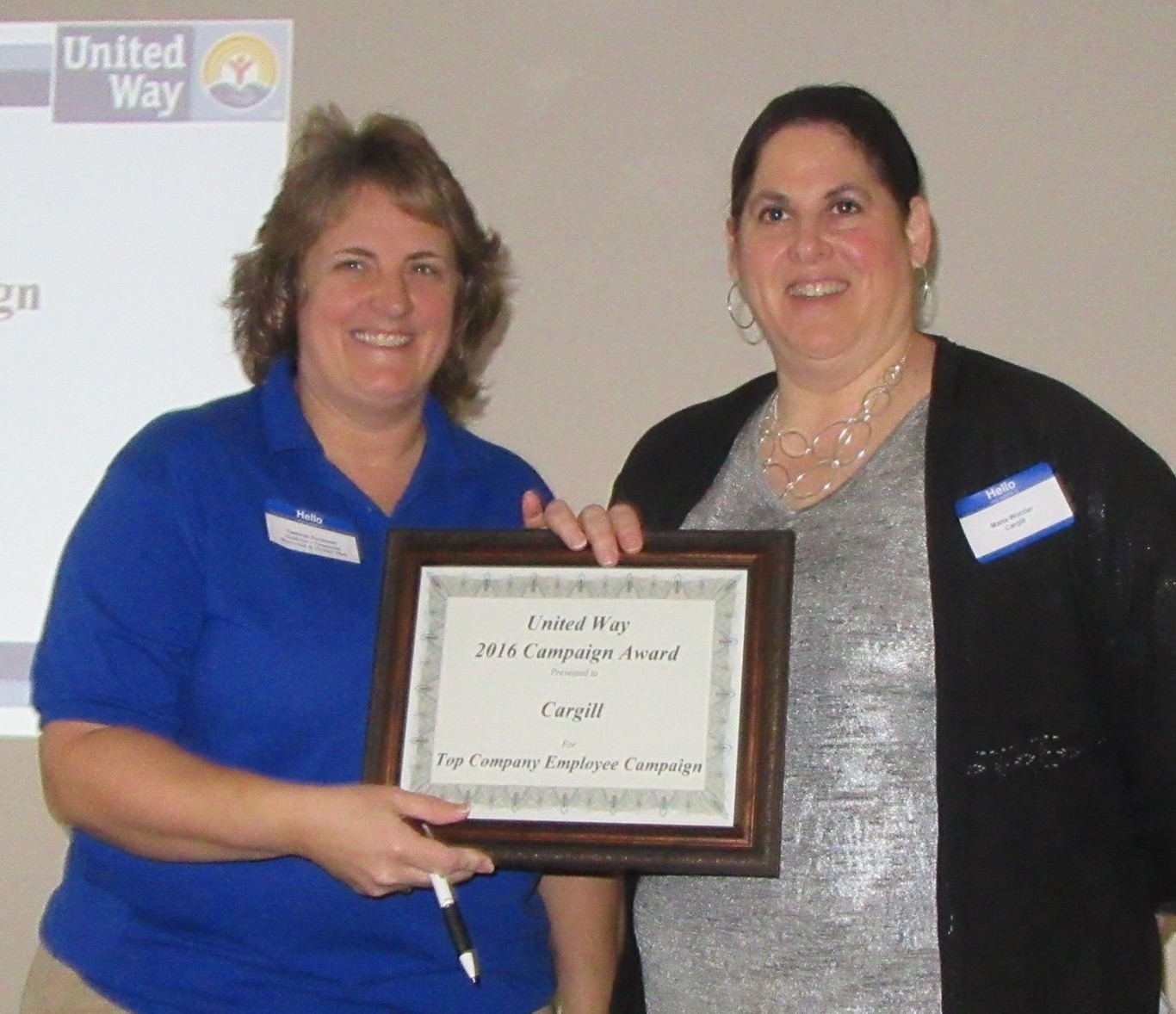 Upon accepting the award, Cargill HR manager Maria Wurzler (below, right) noted that the number of employees who donated $500 or more increased from 76 to 114 during the last year, helping the company to raise more than $158,000 and surpassing the million dollar mark in total donations through the years.