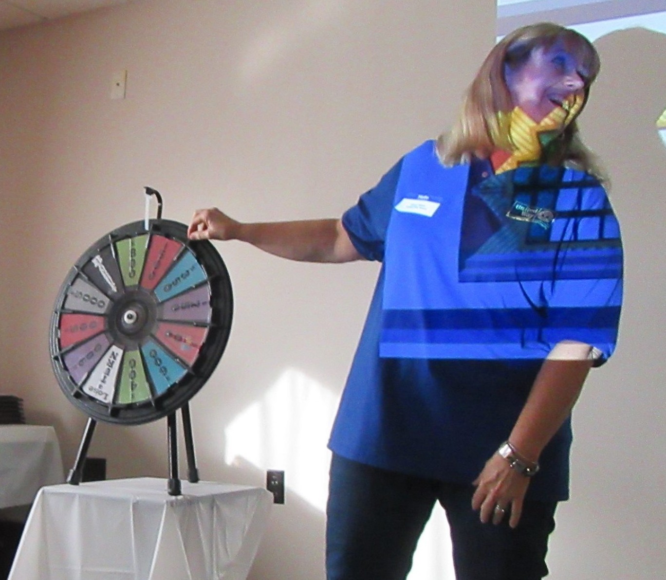 A game of Wheel of Fortune that pitted teams led by UWBC board president Robert Hugo and VP of Allocations Elaine Elliott (below) against each other. Elaine’s won. Then the real winning began as employees who had donated at least one dollar weekly as part of the UWBC’s Pledge to Win initiative were given prizes as varied as airplane rides and date night packages.