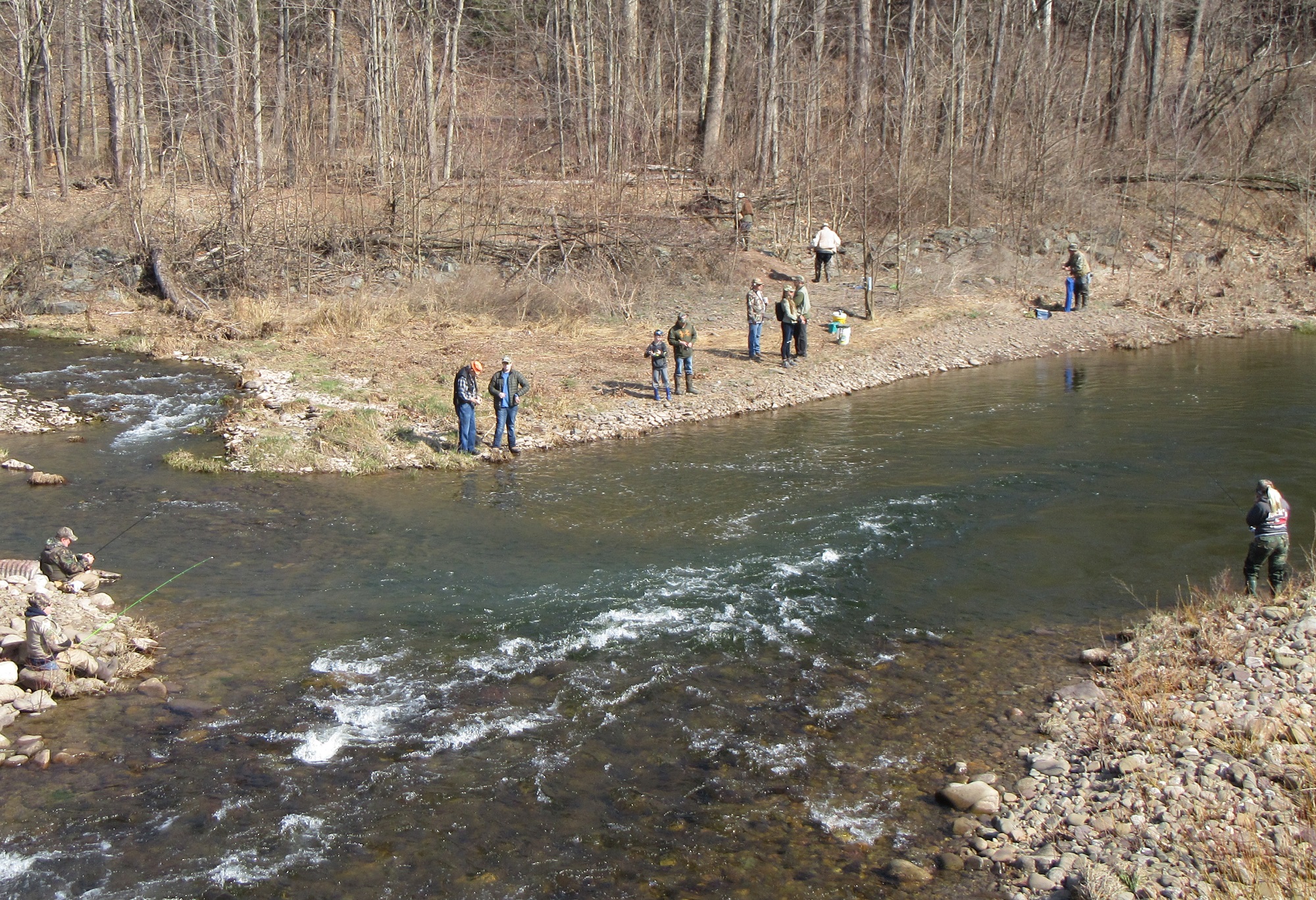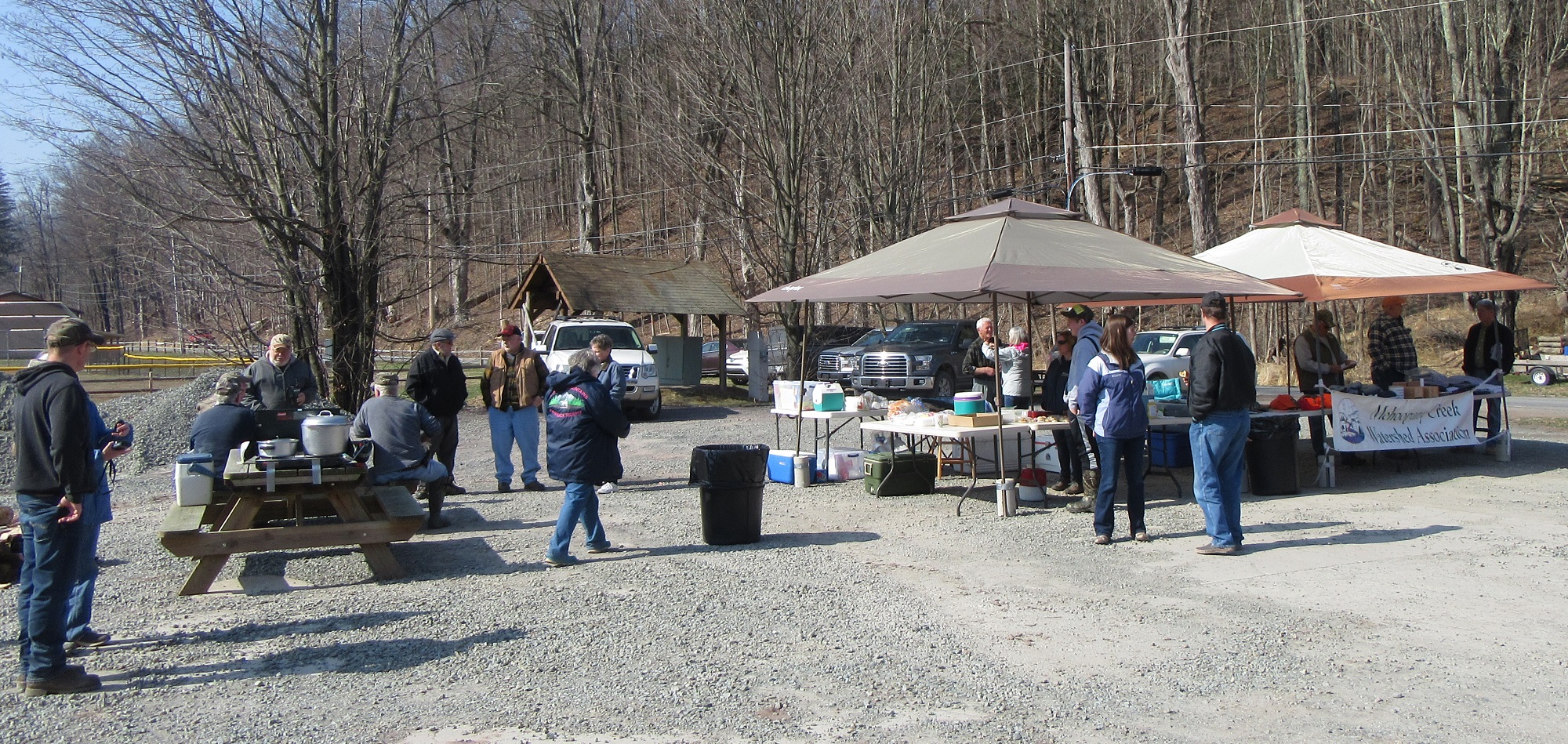 Brilliant sunshine and warmer weather helped draw anglers in near record numbers on Saturday to Forkston Corners, where the North Branch Mehoopany Creek tumbles into the main stem of Mehoopany Creek. Members of the Mehoopany Creek Watershed Association (MCWA) were there to greet them with hot coffee and donuts, hot dogs and other snacks for the first day of trout season. Most noticeable to them were a larger number of youths fishing with parents and grandparents, as well as full stringers of fish.