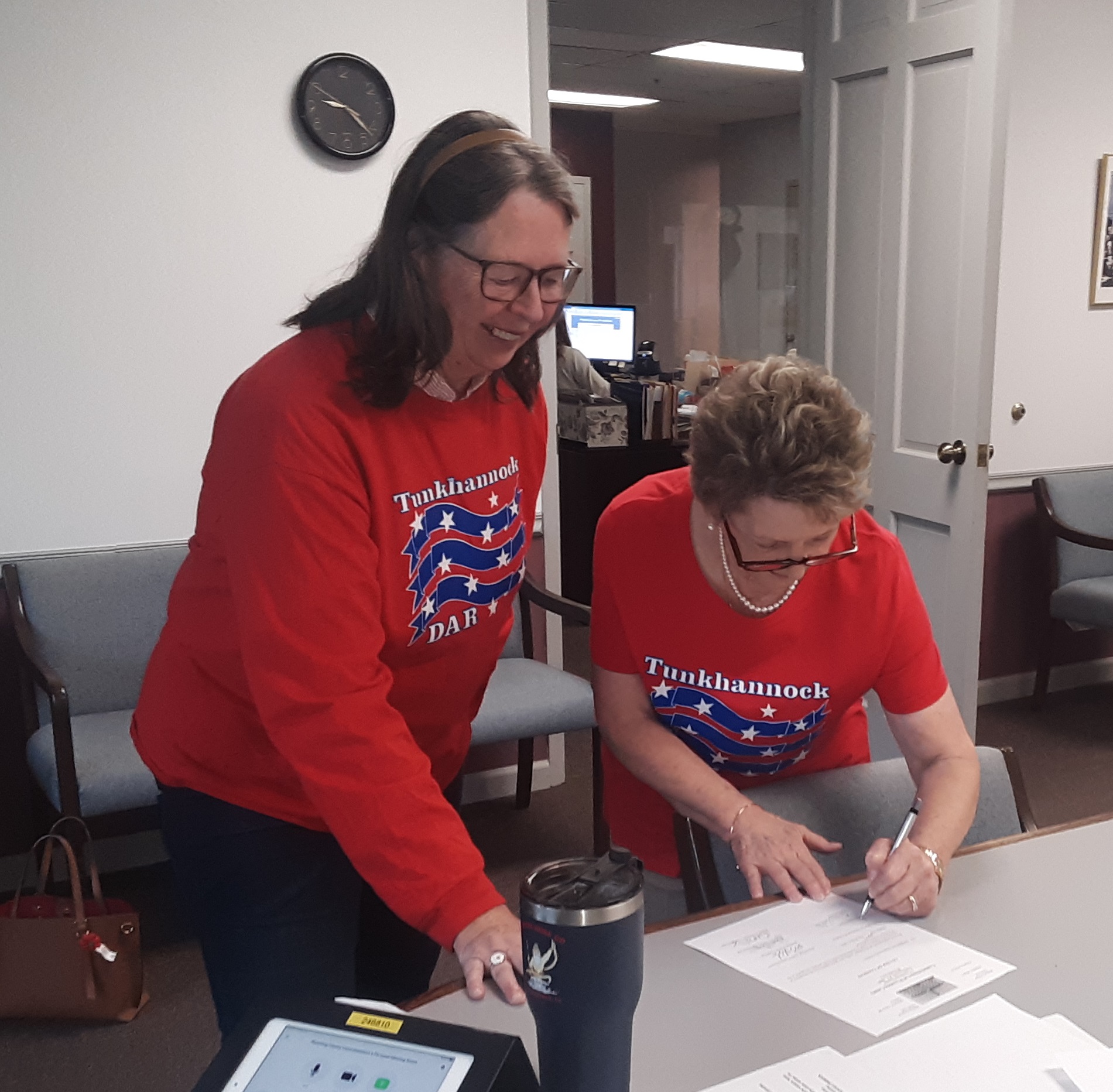 The commissioners unanimously approved plans by the Tunkhannock Daughters of the American Revolution (DAR), represented at the meeting by Nancy Walter and Mary Macarchick (below), to install a granite monument on the courthouse lawn. A letter of consent was signed by all parties.
