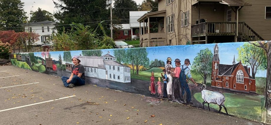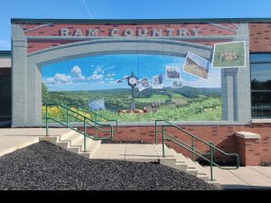 The mural above was completed in 2021 by Sadie Allen (pictured) and is located in the parking lot of the Troy Sale Barn at 50 Ballard St., Troy. Sadie created a mural that reflects on the local history in Troy. Work began on the Wyalusing Pride mural below in 2019 with artist Jonathan Laidacker brainstorming ideas with students from Wyalusing Valley High School at 11364 Wyalusing New Albany Rd, Wyalusing. The mural was designed with their ideas in mind and features a landscape inspired by the Wyalusing Rocks with a ram standing in front of it. There is a clock included to represent the clock in town and also symbolize the passage of time. The photos floating through the landscape show the history of the school and town. Detailed information about the photos in the mural can be accessed by a QR code that will be installed in the Spring of 2022.