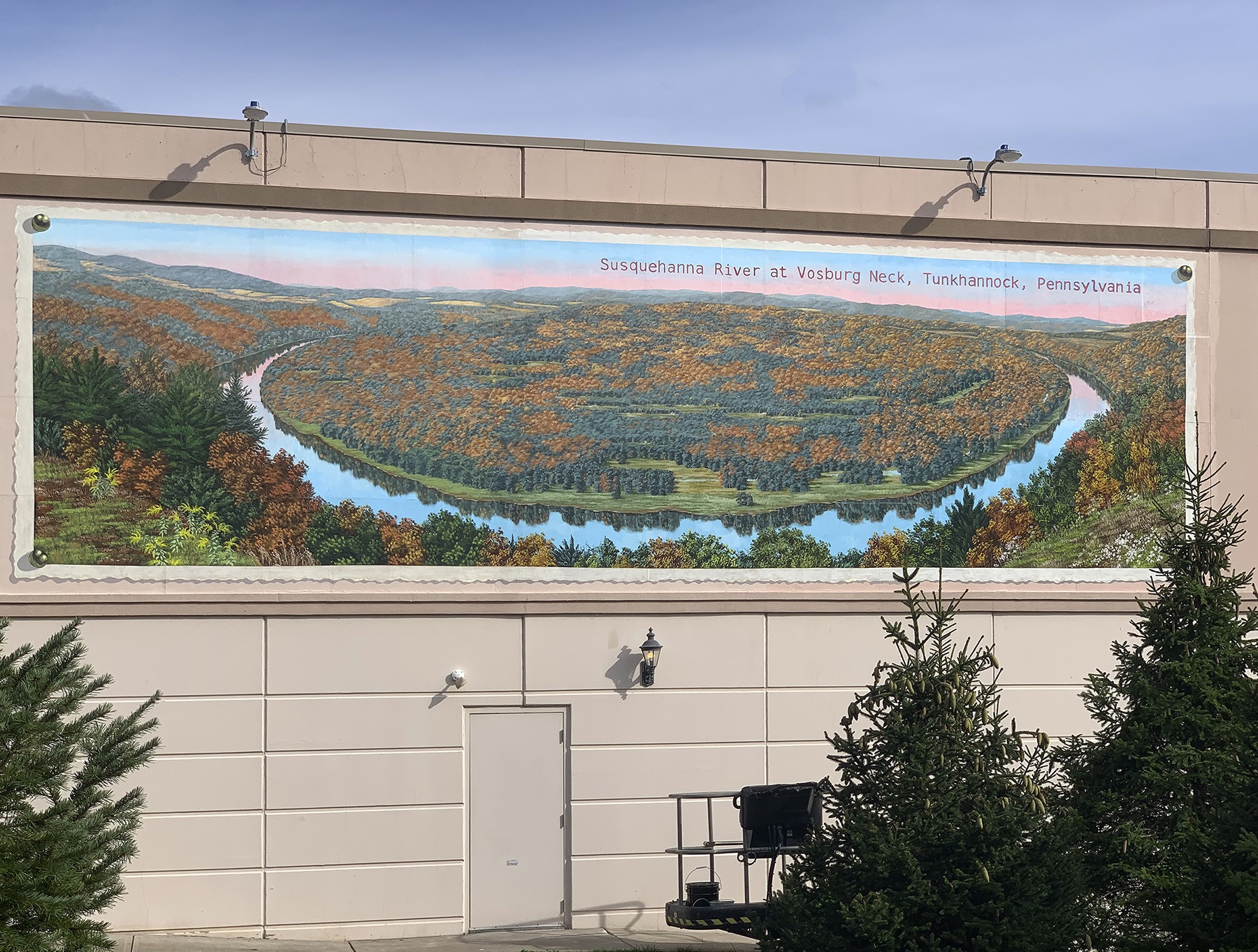 Three murals adorn the historic Dietrich Theater at 60 E. Tioga St. in Tunkhannock. On the southern side of the building are two murals (above) completed in 2019 & 2020 by local artist Bob Lizza. They show one of the most iconic structures in the county, the Nicholson Bridge. Lizza created these murals to look like you can walk right into them. The third mural, facing Bridge Street, is of giant postcard (below) of the Vosburg Neck of the Susquehanna River. This mural was also completed by Bob Lizza from a photograph that was taken from 700 feet above and was completed in 2021.