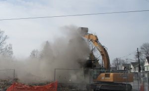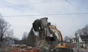 A large crowd gathered in downtown Meshoppen last Friday as a pair of operators moved their excavators into position to push down the last part of the former Tyler Hospital and Kennard Hotel that was methodically demolished over the course of a week. Traffic on Route 6 was stopped briefly to ensure that no debris fell toward the roadway, but everything seemed to go as planned. A large plume of dust followed the final collapse. The lot is earmarked for a truck and car wash.