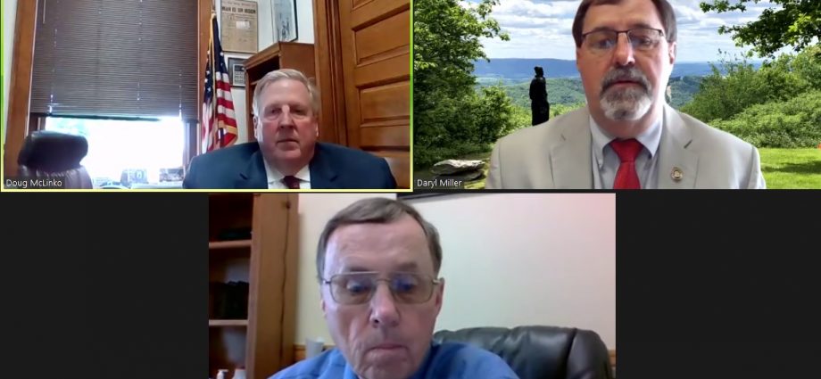 Bradford County Commissioners (top, left) Doug McLinko, Daryl Miller (right) and John Sullivan are still conducting virtual meetings through the end of June but suggested that the public and media will be permitted to participate in live meetings at the courthouse in Towanda again in July.