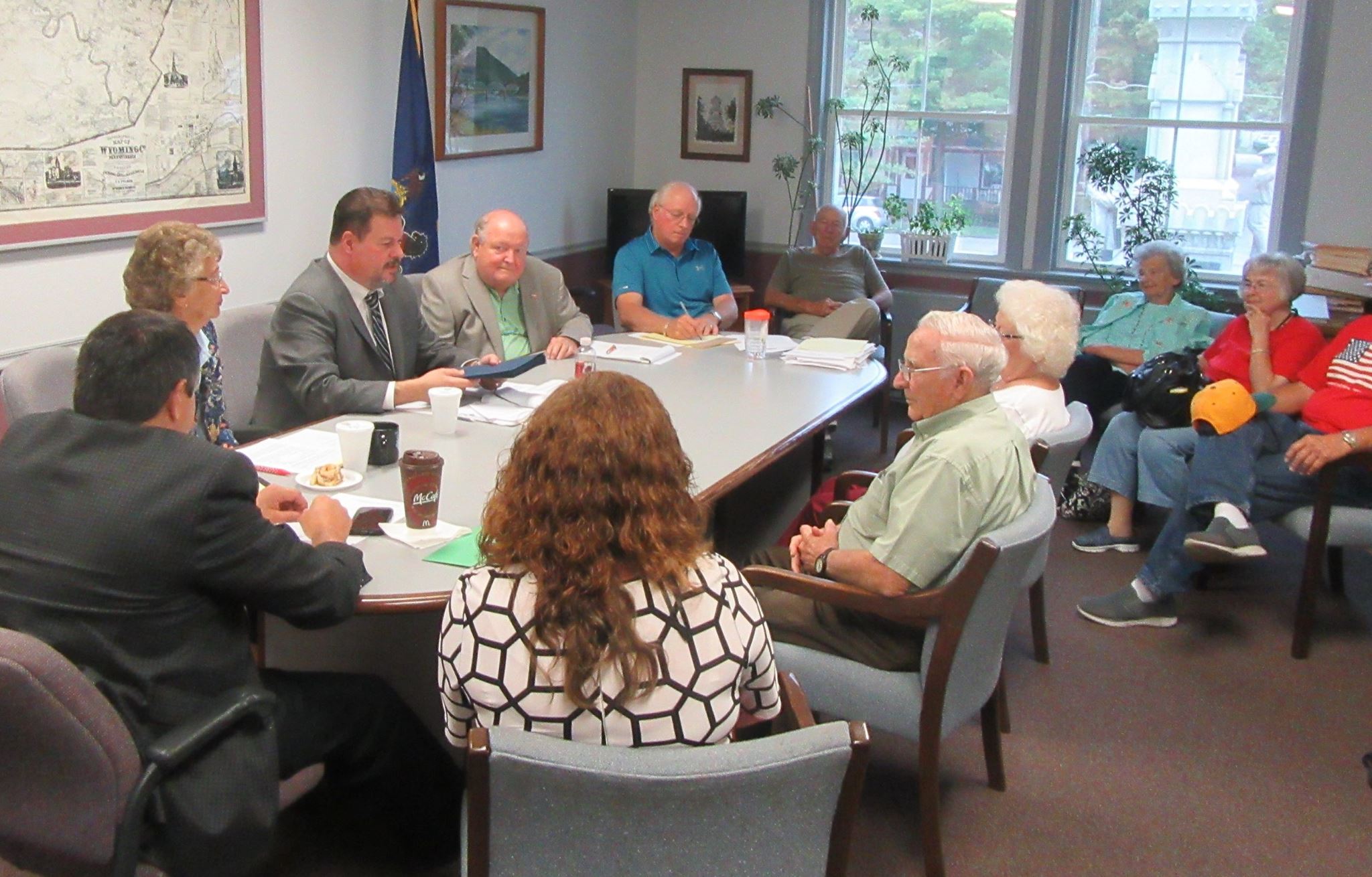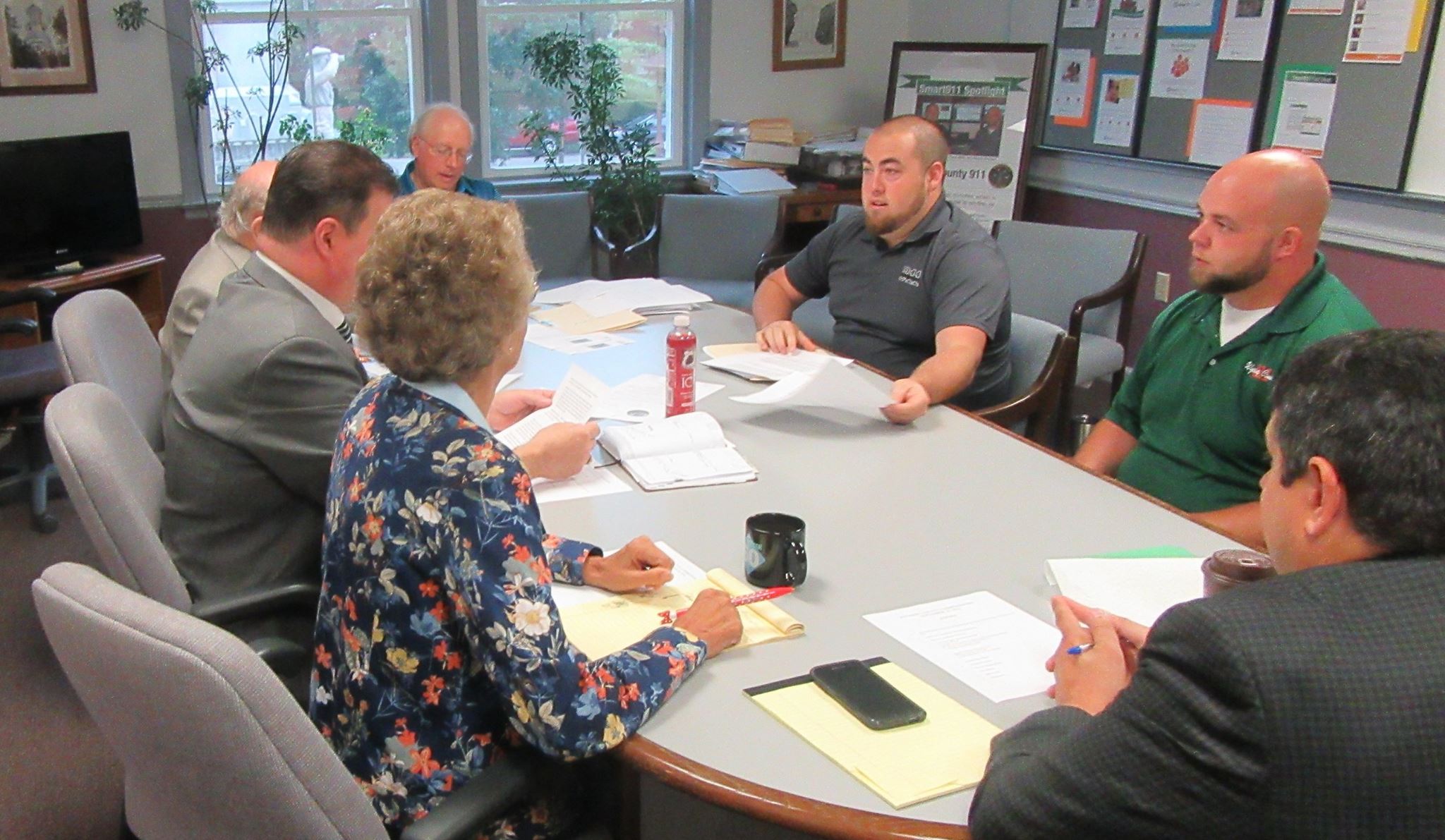 A number of the Wyoming County’s most prolific voters, including (top, standing from left) Ralph Anderson, Nellie Benninger, Shirley Patton, and Sheryl Phillips were honored by commissioners (seated) Judy Mead, Tom Henry and Ron Williams during their Sept. 20 meeting, where Wyoming County 911 Director Jeff Porter (above, left) and Deputy Director Frank Miller brought news of significant improvements to 911-related data transmission.