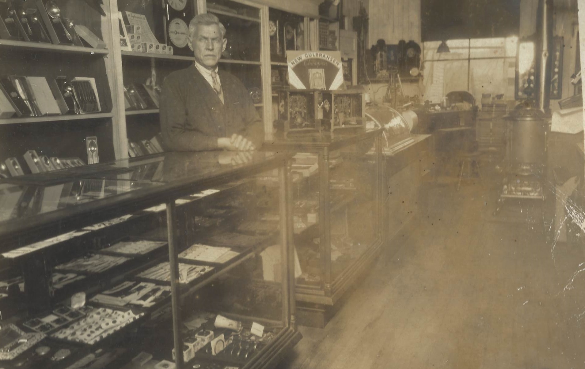 Frank Ward Lacey is shown behind the counter of the watch and jewelry store he ran in Laceyville and later passed down to his son, Arthur.