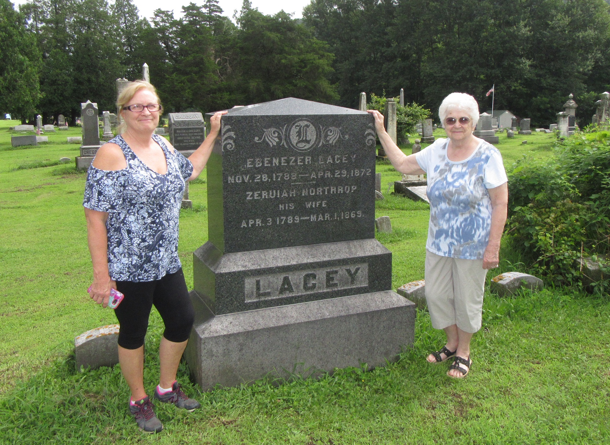 Arthur France Lacey’s name was penned onto this portrait of the Laceyville High School Class of 1926 (top), of which he was Valedictorian. Above, Gladys Lacey Brown (right) and her daughter, Robin Brown, flank a stone erected in memory of Ebenezer Lacey III and his wife, Zeruiah Northrup Lacey. Much older burial stones in the Lacey Street Cemetery mark the graves of the many Laceys that were among Laceyville’s pioneers.