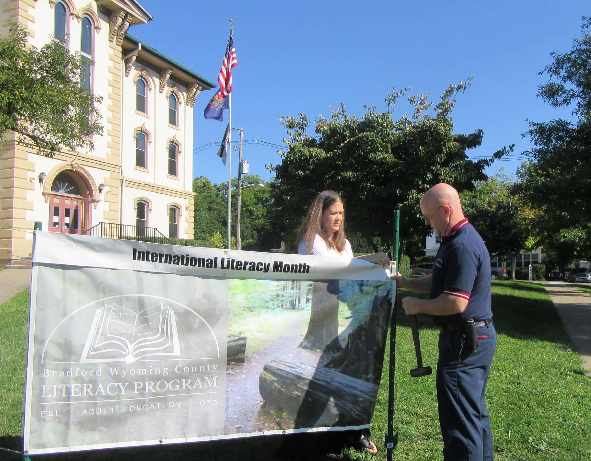 Michele Robbins (top photo, seated right) of the Bradford-Wyoming Co. Literacy Program met with the Wyoming County Commissioners on Sept. 6 to proclaim International Literacy Day on Sept. 8 and Sept. 26 to Oct. 1 as National Adult Education and Family Literacy Week in Wyoming County. Afterwards, she erected a banner on the courthouse lawn with the help of Wyoming County maintenance employee Brian Ball (above, right).