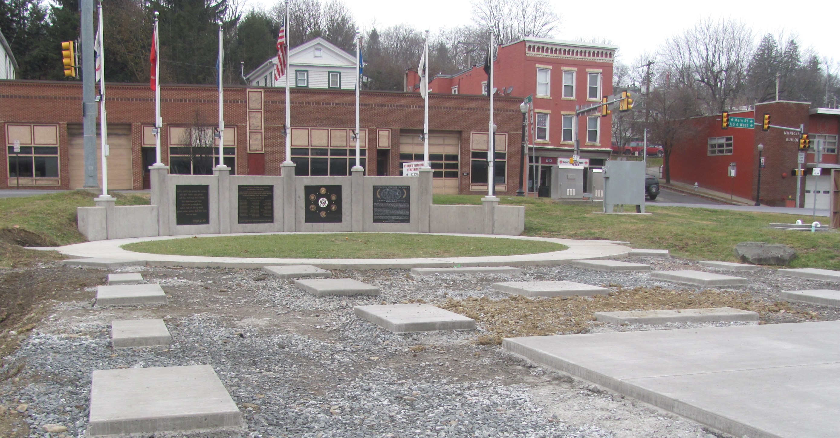 It’s a sure sign that Christmas is on the way when the decorations go up at the home of Jim Ennis Sr. along Route 6 in Wysox Township (top). Read about Mr. Ennis at http://wysox.org/uploads/Jim%20Ennis%20Sr%20-%20revised%20B.pdf. Meanwhile, across Veterans Memorial Bridge in Towanda, work on the Bradford County Veterans Memorial Park (above) continues. Engraved pavers honoring local veterans will be installed as weather permits. According to www.waynesweatherworld.net, a string of milder but mostly cloudy days might be followed by some light snow this weekend. Wayne is feeling pretty confident that we will have snow on the ground on Christmas Day.