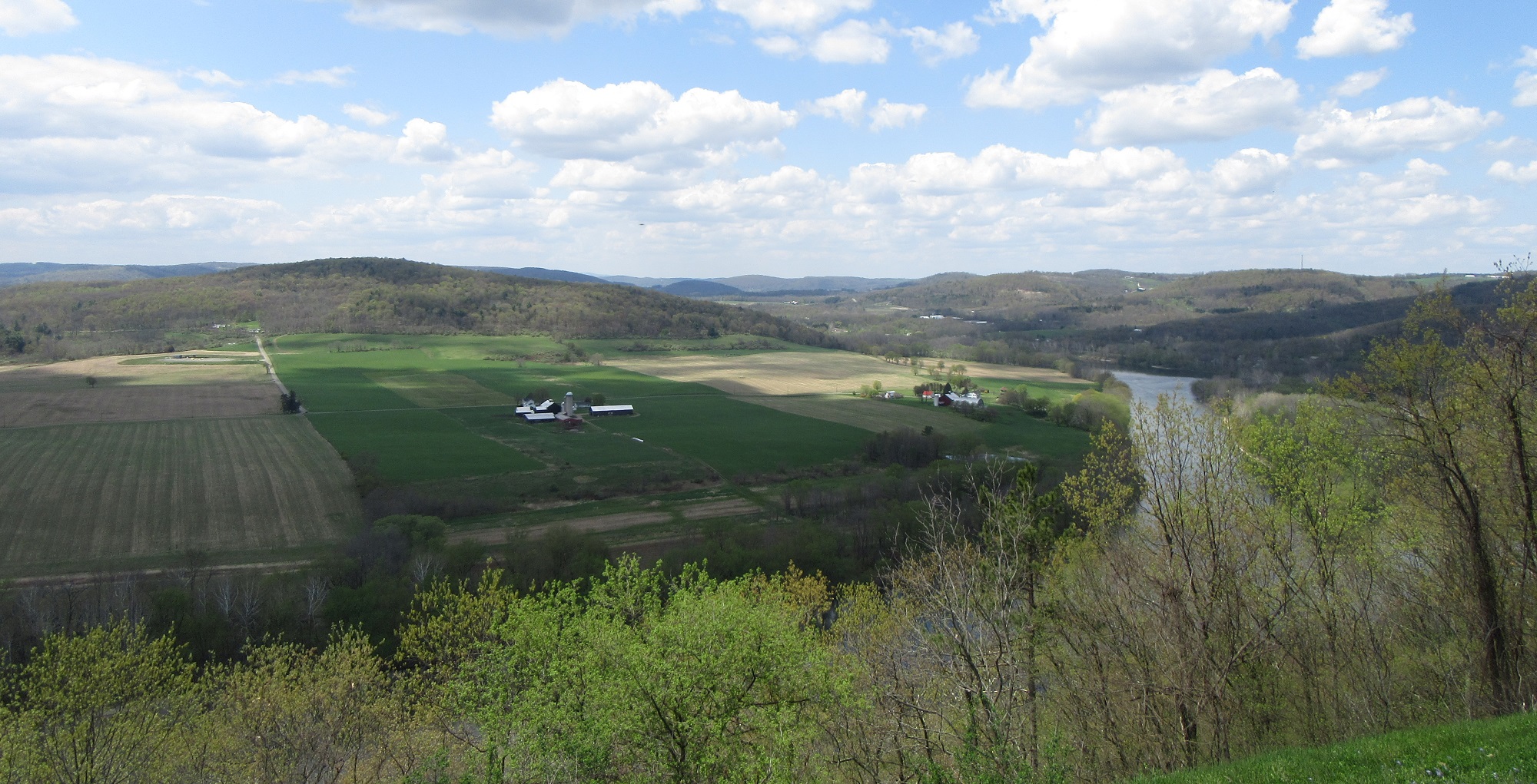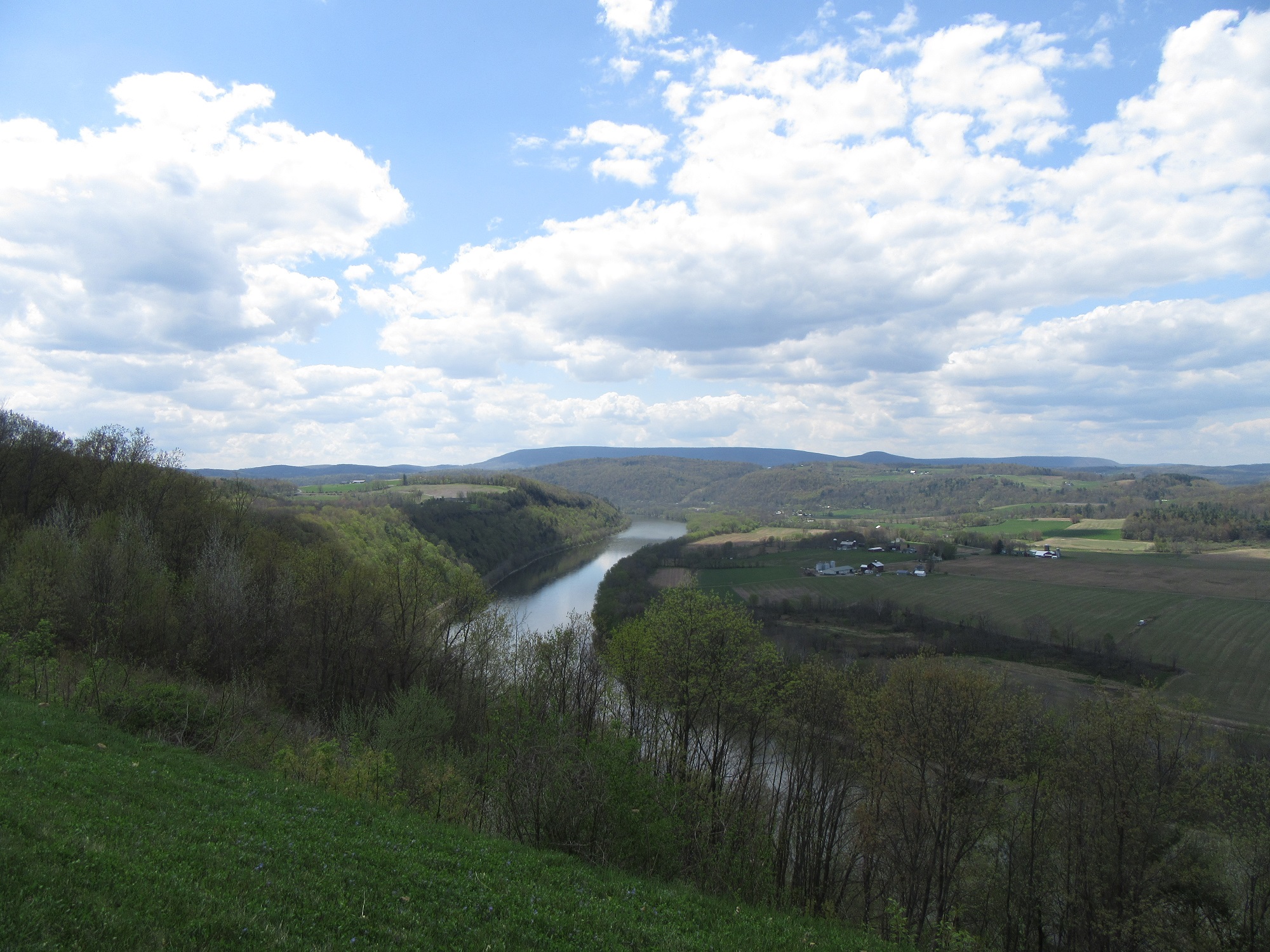 Cumulus clouds cast shadows on the French Azilum peninsula in Bradford County today as temperatures quickly climbed into the 70s. Mile weather will continue, but forecasts vary as to when and where it might rain.