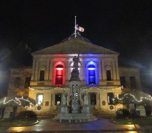 A chilly rain on Monday evening left a haze around the Bradford County Courthouse in Towanda. The iconic structure is festooned for the holidays, but Lady Justice was eclipsed by the American flag, set at half mast as the nation observed the passing of 41st president George H.W. Bush.
