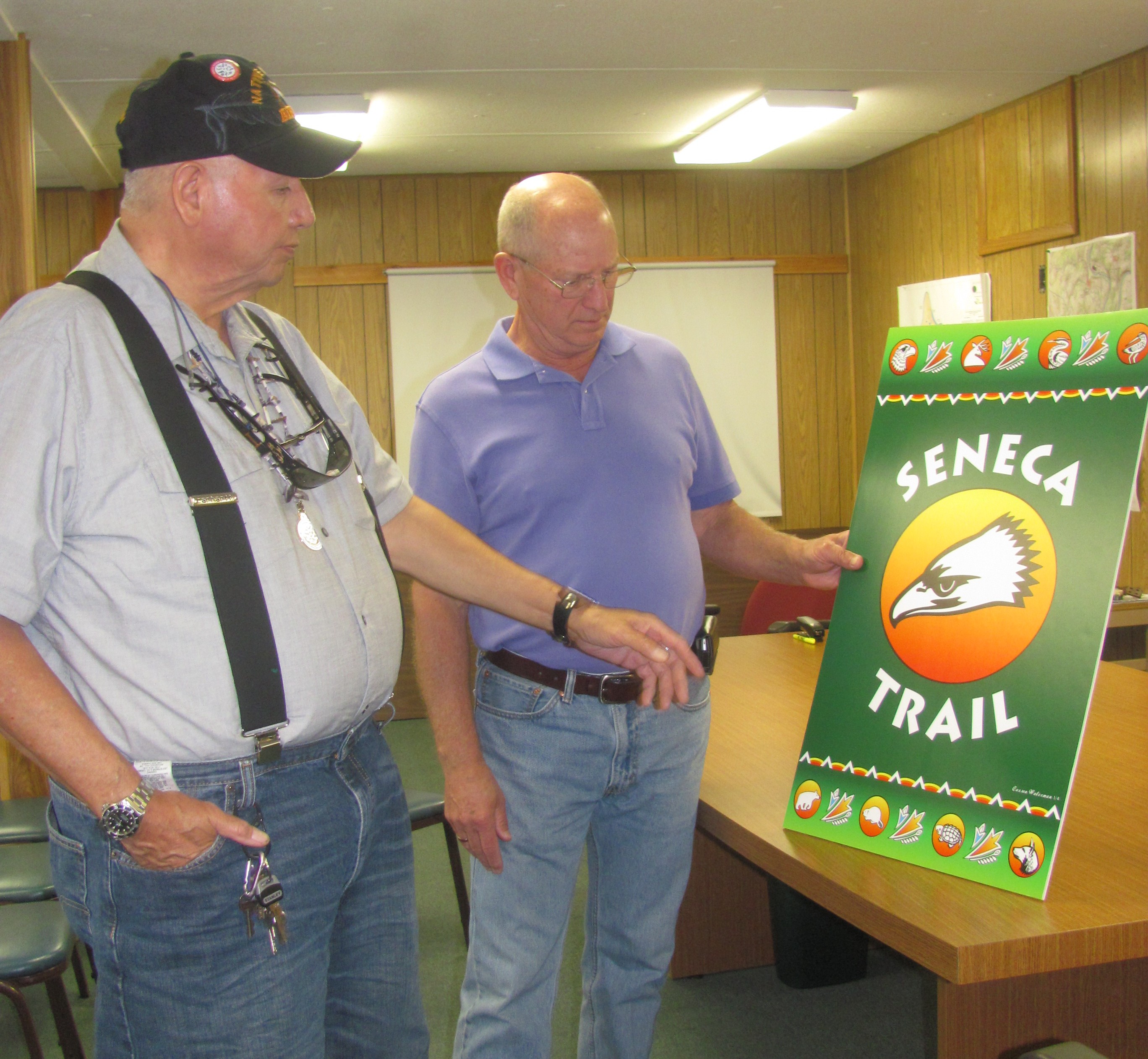 A member of the Seneca Nation of upper New York State visited Eaton Township officials today for the unveiling of a new logo developed to increase awareness of the Seneca Trail in Wyoming County, which parallels six miles of township roads and a portion of state Route 29 to reach the Susquehanna River. The logo, which will be used for signage and promotion, and a trail map were made possible by a grant secured by Endless Mountains Heritage Region (EMHR).