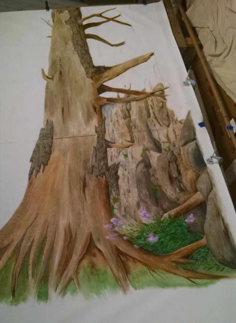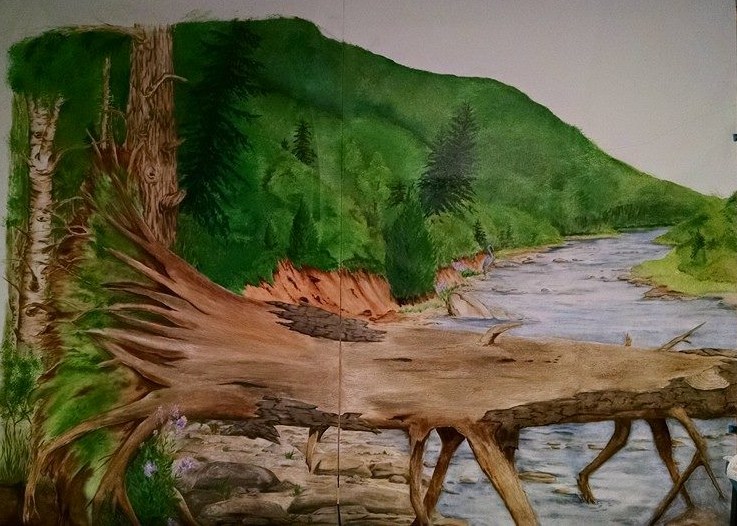 To achieve the detail desired for the project, none of the brushes that Black uses are more than an inch in width. The scenery includes views of the Loyalsock Creek and the wooded mountains that rise steeply away from it, as well as some of the forest creatures not represented by the taxidermy specimens.