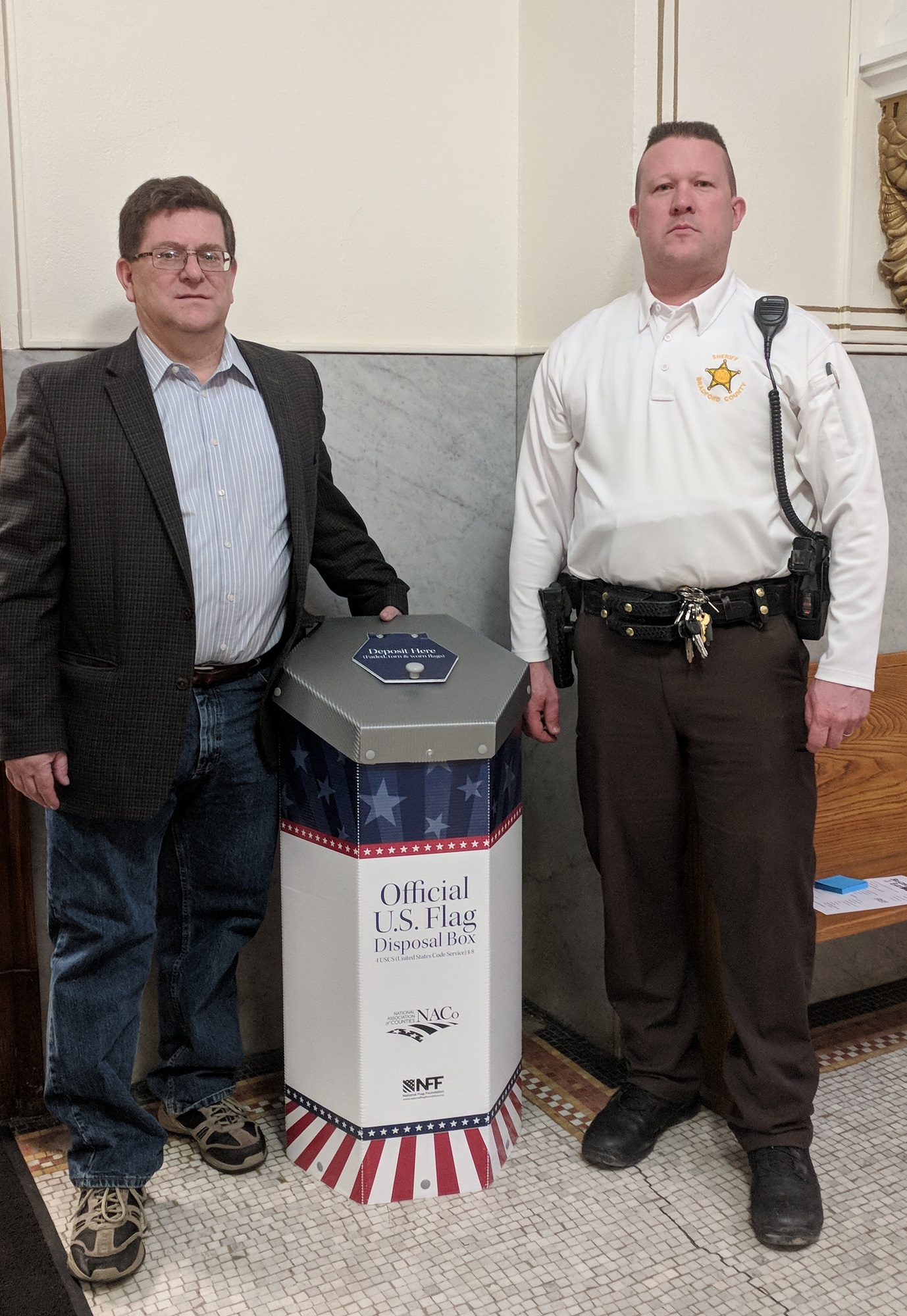 Bradford County Commissioner Ed Bustin (above, left) and Sheriff CJ Walters encourage residents to dispose of worn flags properly by dropping them off in a new bin at the courthouse in Towanda.