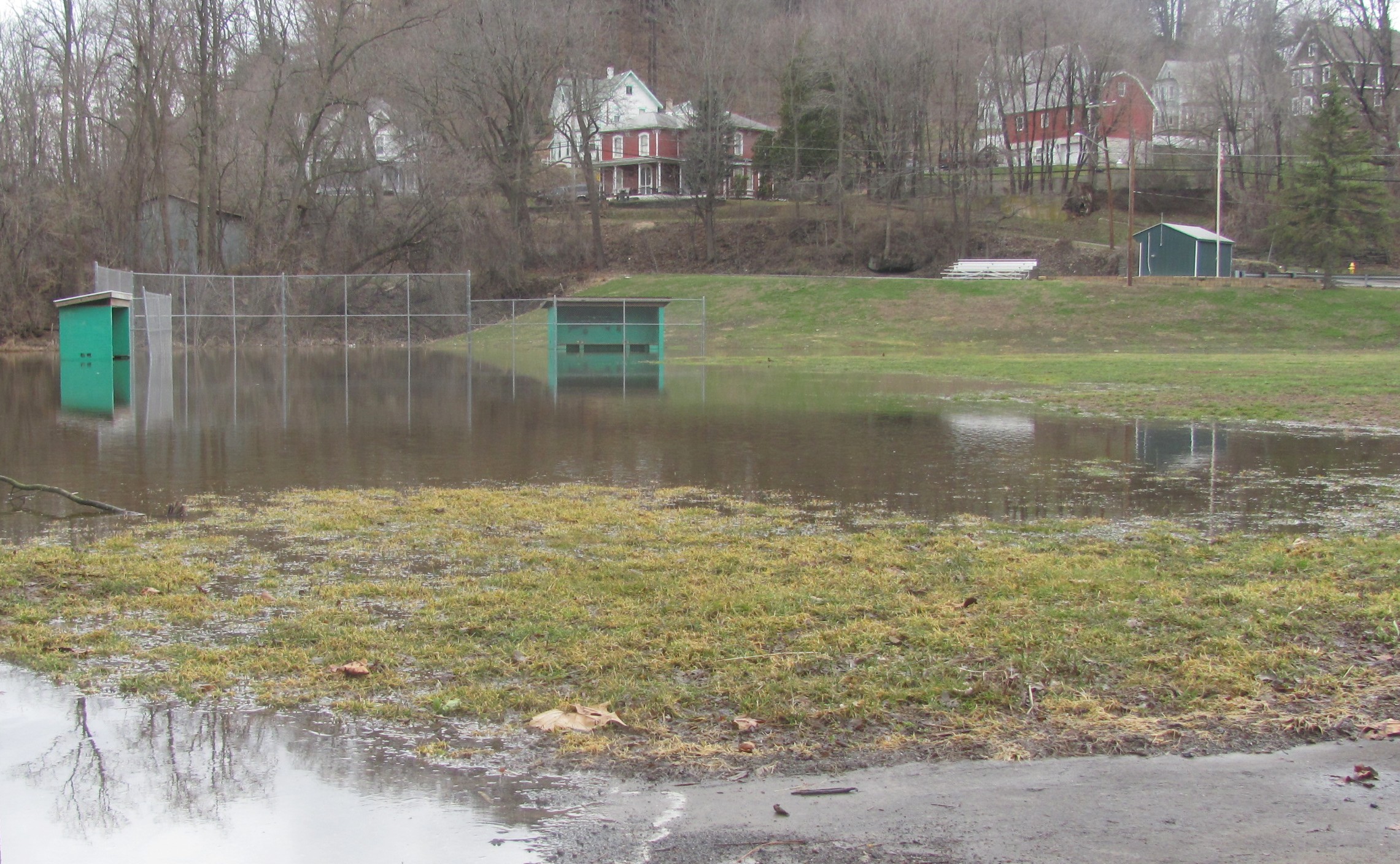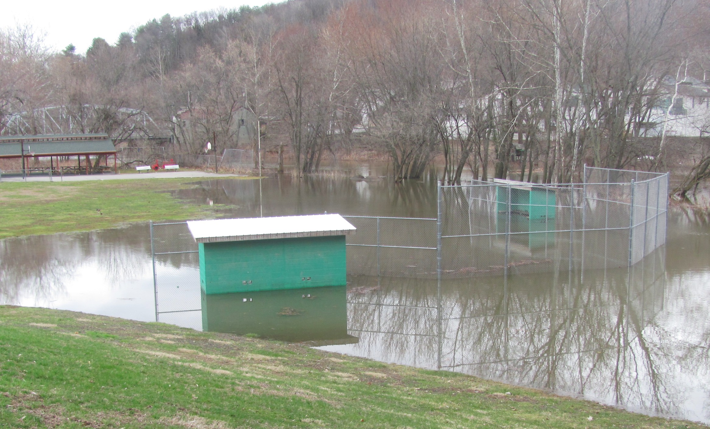 Just one week ago, the annual Meshoppen Holiday Fund Easter Egg Hunt had to be held in the pavilion (above left) because the ball fields were too soggy to use. If held today, the event would likely have been postponed, even though the pavilion was spared by a round of limited spring flooding.