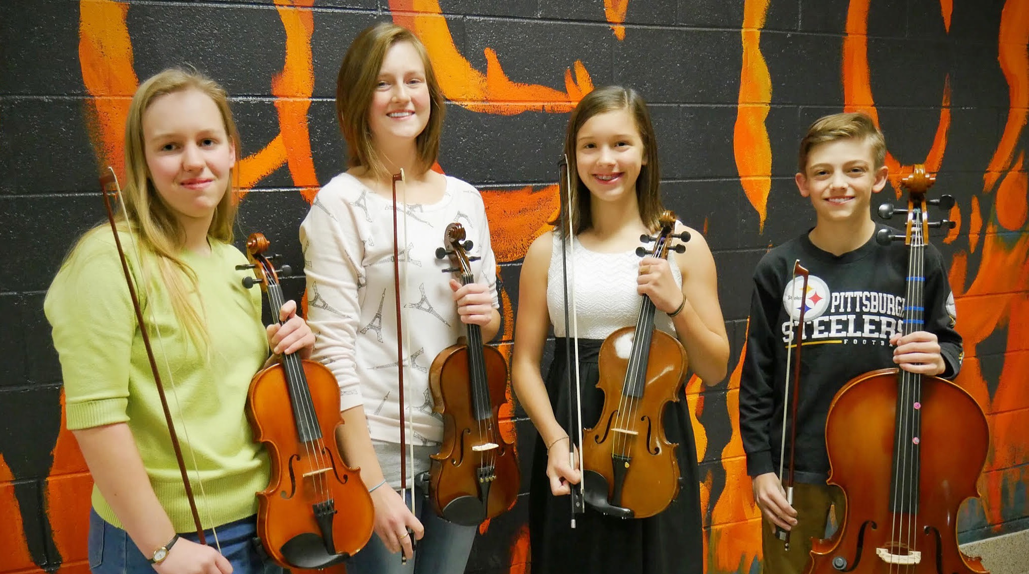 Young musicians (from left) Monica Morris, Maryn Parr, Alison Edwards, and Nathan Thomas, were among those who joined the Northern Tier Symphony Orchestra following last fall’s open rehearsals. The next open rehearsals will be held on Feb. 16 at Tunkhannock Area Middle School. Submitted Article When the Northern Tier Symphony Orchestra holds open rehearsals next month for its upcoming series, musicians of all ages will be hoping to play in one of the orchestra’s concerts. Some will be professional musicians, to be sure, but anyone has a chance. Last year, four high school students gained spots on stage. They include violinists Monica Morris of Meshoppen, Maryn Parr of Tunkhannock, and Alison Edwards of Tunkhannock, and cellist Nathan Thomas of Mountain Top. “I love playing in the Northern Tier Symphony Orchestra because it’s fun!” Morris said. “Playing on this level in a group of musicians improves my own performance.” Edwards called the audition experience “a bit intimidating,” but added that the feeling subsided once she started performing with the orchestra. “I feel like I fit in with a lot of the younger musicians,” she said. The orchestra will begin rehearsals for the spring concert series on Friday, Feb. 16, from 7:30 to 9:30 p.m. at the Tunkhannock Area Middle School auditorium. Musicians who would like to participate should call (570) 289-1090 to discuss openings and obtain the music piece for the rehearsal. There are openings for all instruments, especially strings. The spring concert series is scheduled to include performances at Blue Ridge High School in New Milford on Friday, April 13, and at Tunkhannock Area Middle School on Friday, April 20. The concerts will feature Tchaikovsky’s 1812 Overture, West Side Story, Victory at Sea, España, Waves of the Danube, and Washington Gray’s March. The Northern Tier Symphony Orchestra was founded in 2010 as a non-profit community orchestra with the goal of bringing live classical music to the Endless Mountains region of Pennsylvania. It is based in Tunkhannock, where it presents several concerts each year. Concerts are also presented at other locations in the Northern Tier. The Northern Tier Symphony is a non-profit community orchestra. For more information, contact the orchestra at 570-289-1090, e-mail northerntiersymphony@yahoo.com, or visit www.northerntiersymphony.org.
