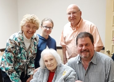 Charlotte Montross Hadsall, recognized as the first appointed female commissioner in Wyoming County, fulfilling the term of her late husband Emerson Jack Montross, was visited today by current county commissioners Judy Mead (left), Tom Henry (right), Mike Stabinsky (second from right) and Judy’s granddaughter, Emily. Charlotte turned 101 at the Gardens at Tunkhannock.