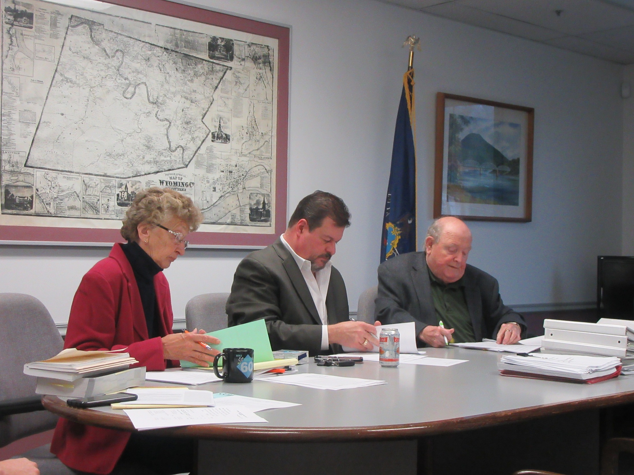 Wyoming County Commissioners (above, from left) Judy Mead, Tom Henry and Ron Williams work their way through a pile of new contracts that will keep the county’s recycling program in business for the next 10 years.