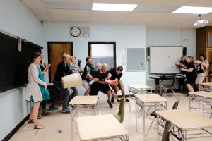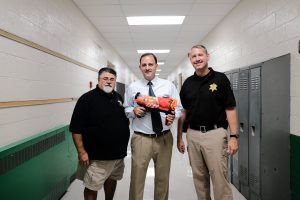 Elk Lake School District staff (top) practice counter techniques for those who do not have time to evacuate, lock down, or barricade. Above, Susquehanna County D.A.R.E. officer Gene Michimski (left) and deputy sheriff Jon Record (right) conducted ALICE training at the Elk Lake School District in August. District superintendent Ken Cuomo holds the soft touch gun used in the drills. The district has since conducted active shooter drills with students.