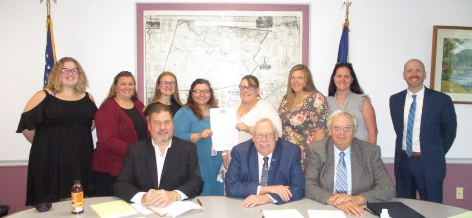 Wyoming County commissioners (seated, from left) Tom Henry, Rick Wilbur, and Ernie King marked Child Welfare Professionals Appreciation Week with (standing) county caseworkers Jordan Flynn, Casey Sickler, Amy Llewellyn, and Christine Solomon; supervisors Kelly Heatherman and Meagan Janiszewski; caseworker Crystal Miller, county human services director John Alunni, and (not pictured) caseworker Deanna Habib.