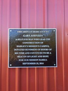 Gary Johnson (top) handles a horse inside the arena he helped to construct that was later dedicated to him. Gary Johnson and his wife, Shirley (above, left), next to the dedication plaque on the exterior of the arena.