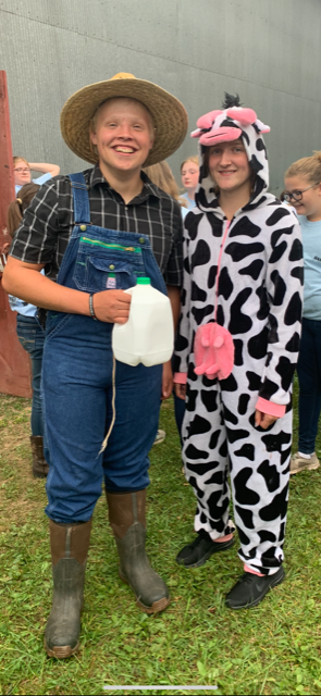 Noah Phillips (top, left) conducts a dairy trivia game with former dairy maid Taylor Bottiglieri at the 2017 Fall Festival and Lumberjack Competition. Above, Noah and Lynsay Trostle dress down a bit to have some fun and spread the word about dairy farming among youths.