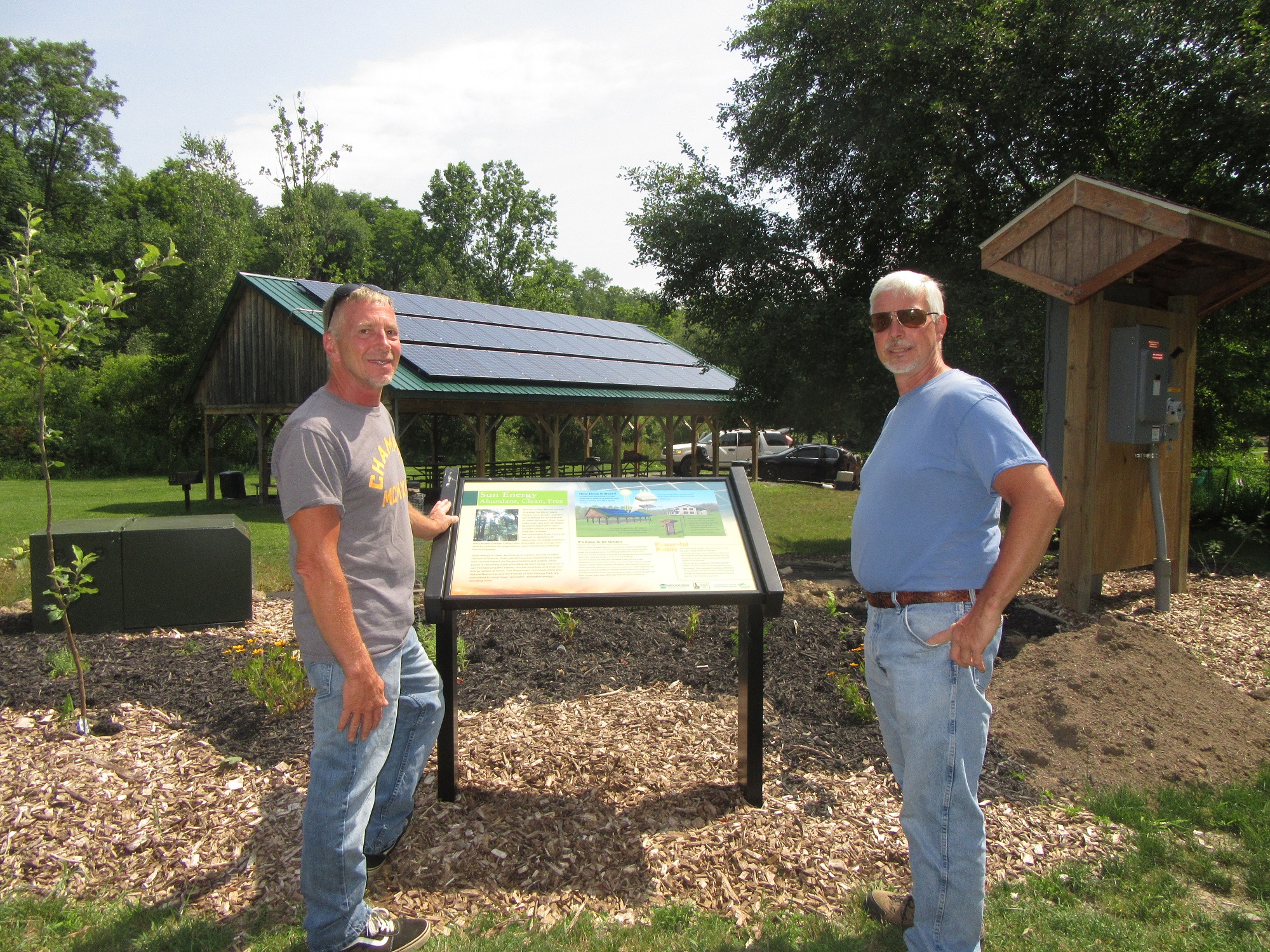 Friends of Salt Springs State Park president Tom Stoll (top, with clipboard) gestures to the Williams Company Pavilion as he provides details about a solar energy system installed last summer. Jim Belmont (above, right) of Lakeside and his brother Joe from Florida, check out the interpretive panel at Salt Springs State Park that explains the installation of a solar panel system on the Williams Company Pavilion in the background.