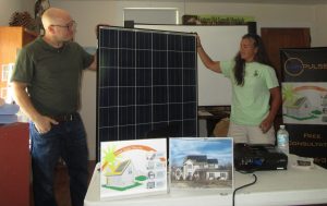 David Robins of SunPulse Solar (above, left) and Salt Springs State Park environmental educator Concetta Schirra display a typical solar panel used on rooftops or ground mounts.