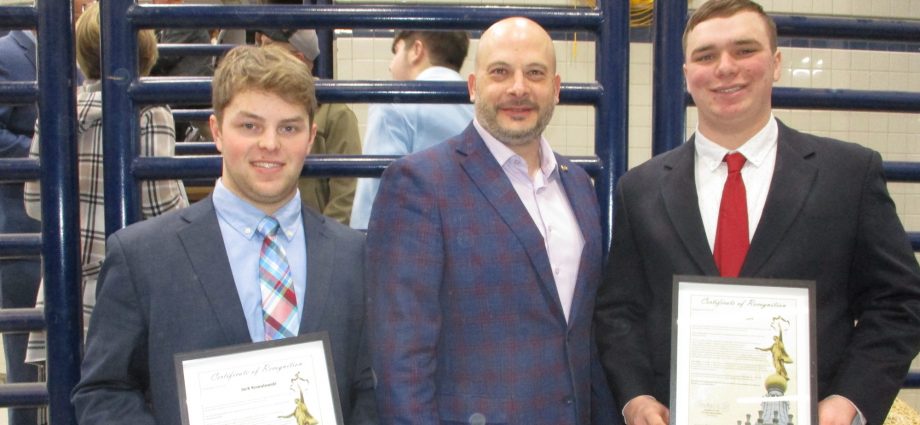 Among this year’s recipients were Alex Ampet and Jack Kowalewski of Susquehanna County, who had both been showing livestock in the same Small Arena for many years as 4-H members. In addition to their parents and other family members, the young men were joined on stage by Rep. Jonathan Fritz.